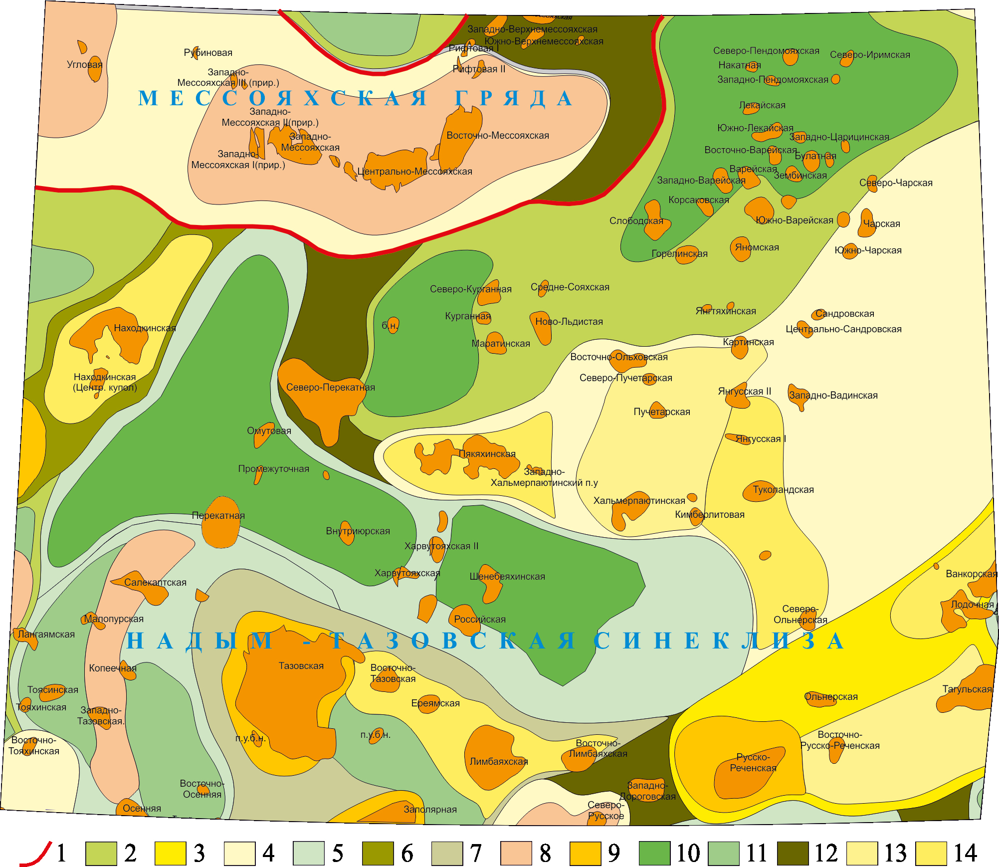 Рисунок 1. Фрагмент структурно-тектонической карты Мезозойско-Кайнозойского чехла Западно-Сибирской геосинеклизы под редакцией И.И. Нестерова (1984): 1 – границы надпорядковых структур; тектонические элементы I порядка: 2– впадина, 3 – зона поднятий, 4 – мегавал, 5 – мегапрогиб, 6 – мегаседловина, 7 – моноклиналь; тектонические элементы II порядка: 8 – вал, 9 – куполовидное поднятие, 10 – котловина, 11 – прогиб, 12 – седловина, 13 – структурный мыс, 14 – структурный нос.
