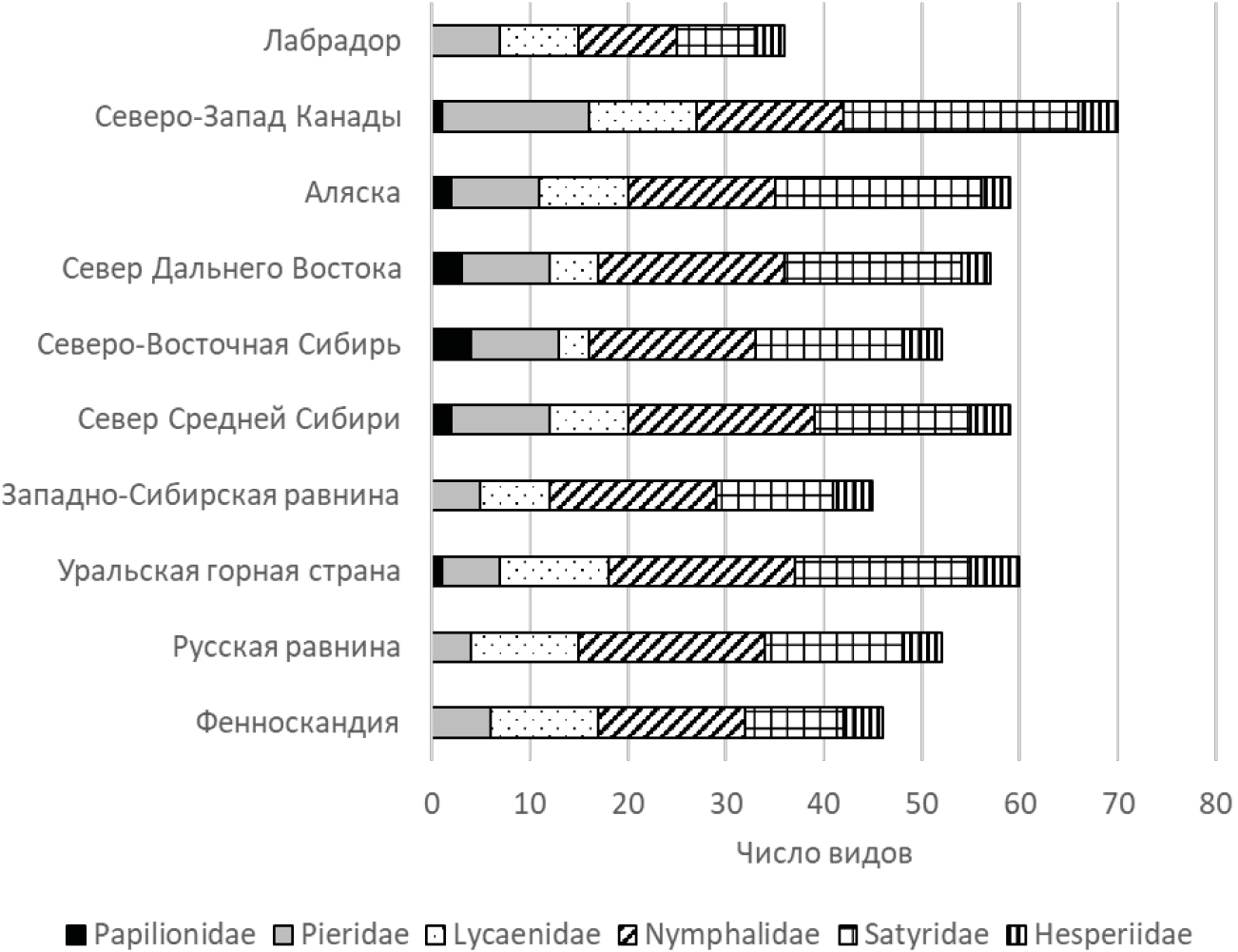 Видовое богатство гипоарктической фауны булавоусых чешуекрылых Евразии и Северной Америки в целом мы оцениваем в 140–150 видов из шести семейств. Коренными (имеющими устойчивые популяции в зональных и интразональных местообитаниях) могут считаться 125–130 представителей надсемейства (рис. 1), остальные являются сезонными мигрантами, необионтами, связанными исключительно с антропогенными условиями, или видами, чей статус обитания в высоких широтах остается неясным из-за крайне низкой численности и встречаемости.
