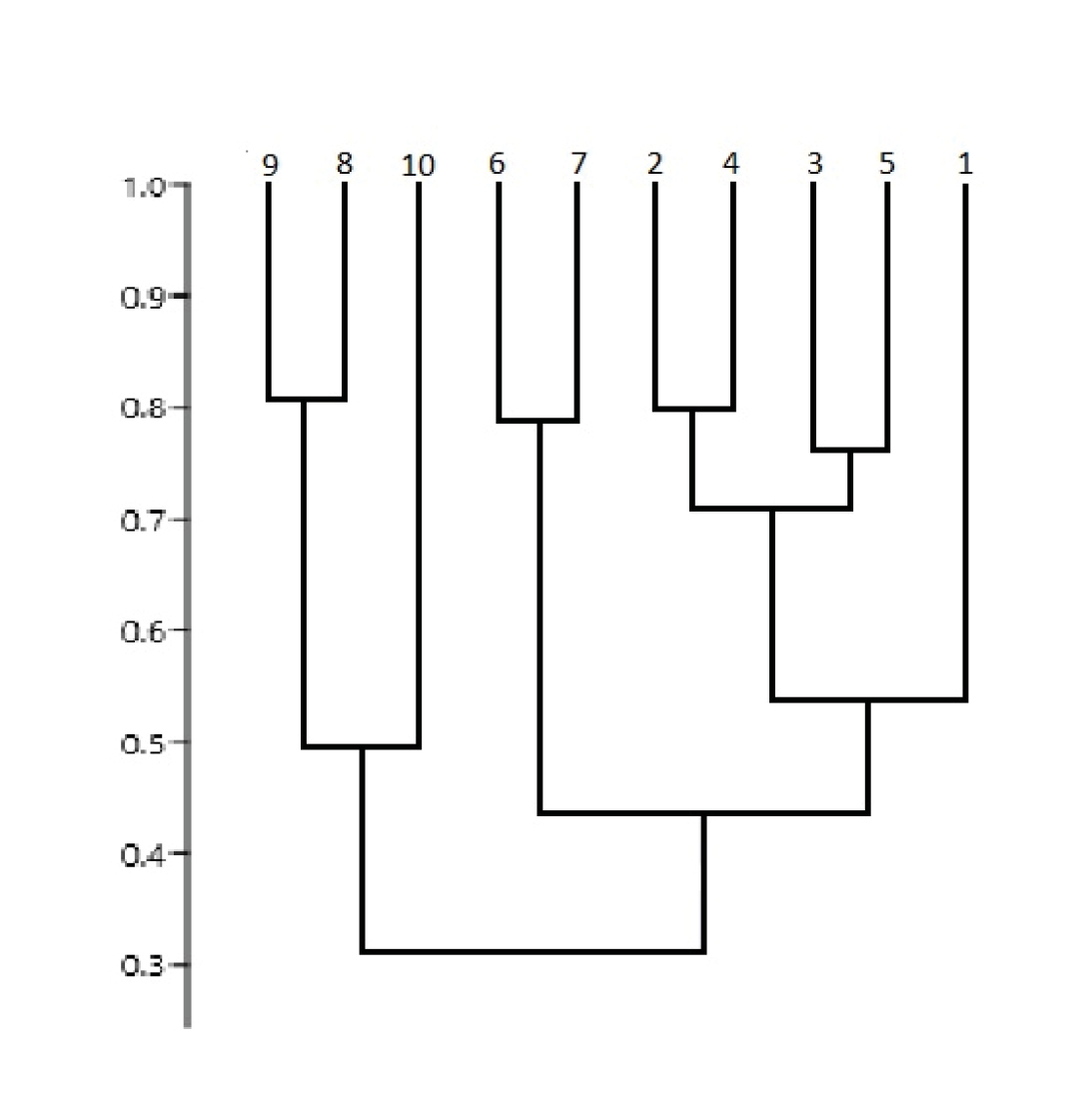 Figure 2. Similarity dendrogram of the species composition of the hypoarctic butterfly faunas: 1 – Fennoscandia; 2 – Russian Plain; 3 – Ural; 4 – West Siberian Plain; 5 – North of the Central Siberia; 6 – North-Eastern Siberia; 7 – North of the Far East, 8 – Alaska, 9 – North-West of Canada, 10 – Labrador.
