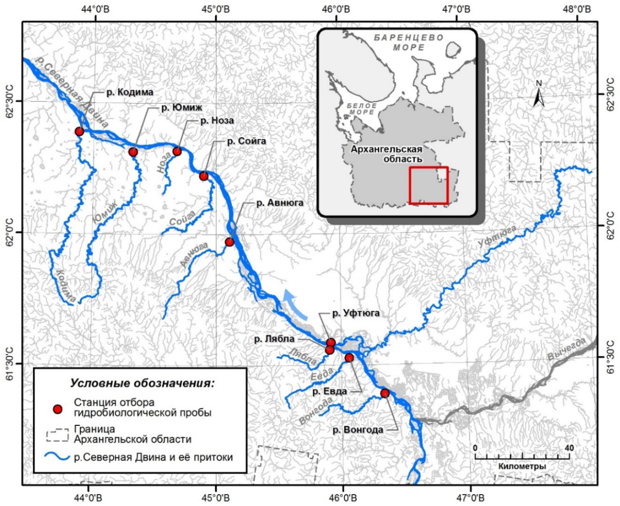 Северная Двина образуется слиянием рек Сухоны и Юг и впадает в Двинскую губу Белого моря. До впадения р. Вычегды называется Малой Северной Двиной, а после впадения р. Вычегды – Большой Северной Двиной. Общая протяженность р. Северной Двины – 744 км, в том числе Малой – 74 км, Большой – 670 км [2]. Площадь северодвинского водосбора – 357 тыс. км2, из них порядка 80 % приходится на леса, 8 % – на болота, 0.4 % – на 17 602 озера, остальные территории относятся к пойменным лугам и антропогенному ландшафту. Речная сеть развита очень сильно – в ее состав входит 61 878 рек и ручьев, средняя густота речной сети по бассейну составляет 0.58 км/км2 [3]. Русло р. Северной Двины условно разделяется на три участка между впадениями главных притоков: верхнее течение (от устья р. Вычегды до устья р. Ваги), среднее (от устья р. Ваги до устья р. Пинеги) и нижнее течение, или устьевая область (от устья р. Пинеги до вершины дельты р. Северной Двины). В 2021 г. выполнен сбор бентосных проб на девяти притоках, впадающих в р. Северную Двину в ее верхнем течении, на участке от 442 до 652 км устья (табл. 1).