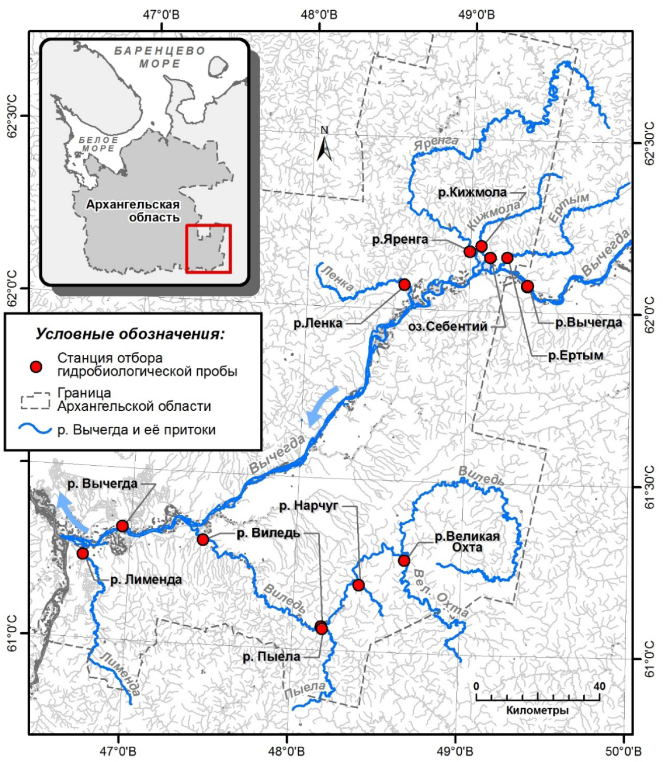 р. Вычегда, 222 км | р. Вычегда, 23 км | р. Ертым | р. Кижмола | р. Яренга | р. Ленка | р. Виледь, 11 км устья | р. Виледь, 69 км | р. Лименда | р. Пыела | р. Нарчуг | р. В. Охта | оз. Себентий | ||
