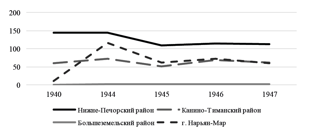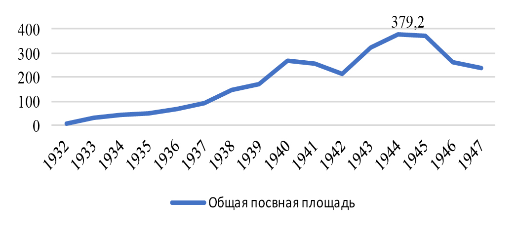 Динамика посевных площадей округа характеризуется значительным ростом в период с 1932 по 1947 г. (рис. 3). Наибольший рост отмечен в годы Великой Отечественной войны (далее – ВОВ) с пиком в 1944 г. (379.2 га), что было обусловлено сокращением завоза продуктов в округ.