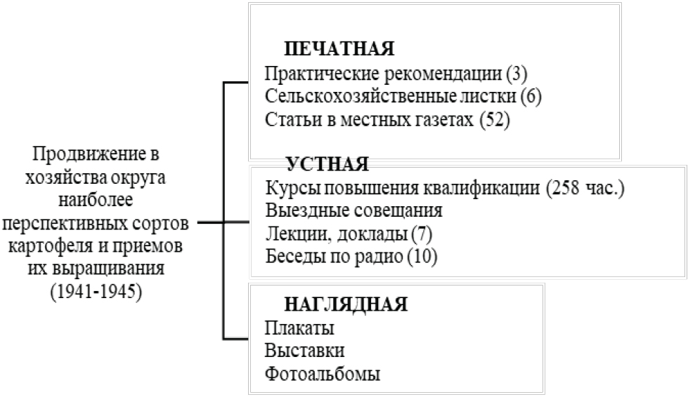 Рисунок 6. Продвижение в хозяйства округа наиболее перспективных сортов картофеля и приемы их выращивания (1941–1945) с использованием различных средств пропаганды.