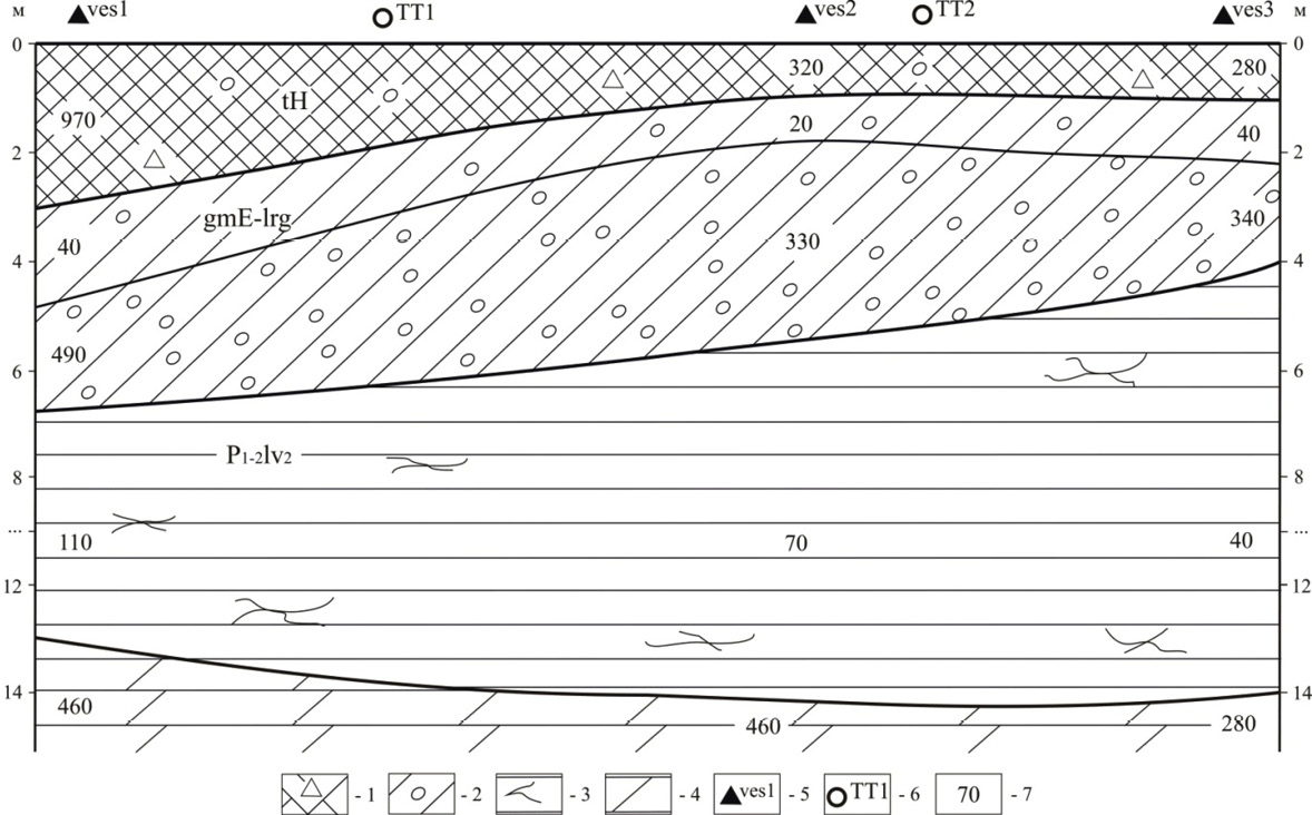 Рельеф оползневого склона – денудационный, представлющий собой эрозионный склон современной речной долины. Схема оползневого склона показана на рис. 1. Вдоль бровки оползня построен геоэлектрический разрез (рис. 2). По материалам [22], в верхней части разреза залегают техногенные образования (tH) неоднородного состава мощностью 0.4–1.5 м: щебень, дресва, галька и гравий, встречаются включения суглинка. До глубины 3.0 м состав насыпных грунтов может быть несколько иной: гравий, галька, включения песка и суглинка. Содержание крупных фракций (d > 2 мм) – около 20 %. Такая неоднородность подтверждается большим диапазоном значений удельного электрического сопротивления горизонта – 280–970 Ом·м. Далее до глубины 4.0–6.8 м следуют среднечетвертичные отложения, представленные ледниково-морскими суглинками (gmE–lrg) с увеличением содержания гравия и гальки к подошве и возможными прослоями песков и супесей, среднее содержание – от 5–10 до 20–25 % [23, 24]. Ниже (до 13–14 м) залегают полускальные пермские отложения (P1-2lv2) и представляют элювий коренных пород: переслаивание сильно выветрелых, трещиноватых, глыбо–щебенистых песчаников, алевролитов, аргиллитов, углистых аргиллитов и углей. Также они могут переслаиваться со скальными прочными и средней прочности породами. Скальный горизонт выделяется как слой удельного электрического сопротивления 275–460 Ом·м. В районе исследований находится пермский подмерзлотный водоносный комплекс терригенных отложений.