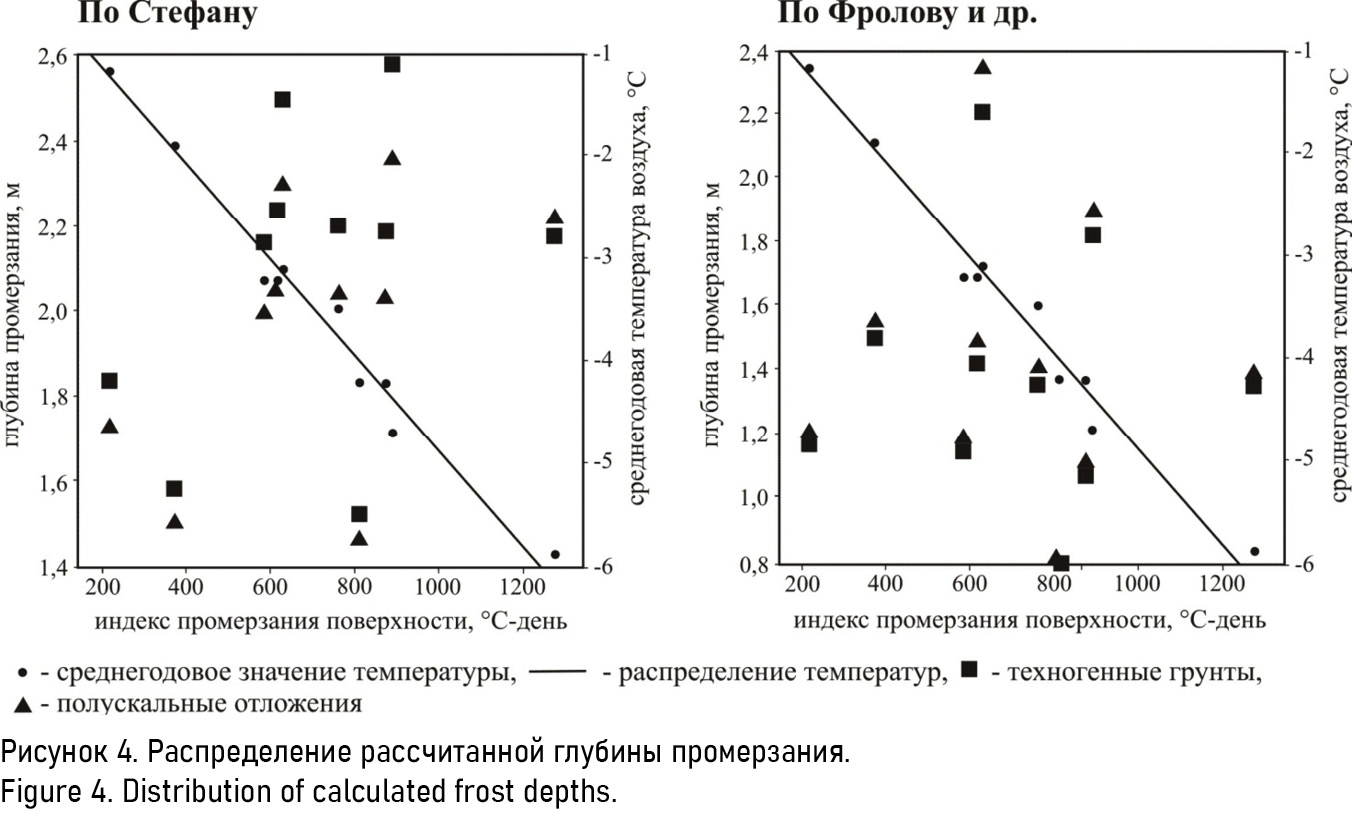 В инженерной геологии существует параметр «индекс промерзания поверхности» – искусственная величина, которая зависит от температуры воздуха и продолжительности холодного периода. На рис. 4 рассчитанные глубины промерзания сопоставлены с индексами промерзания поверхности (табл. 4) при среднегодовых температурах. Глубина промерзания в целом имеет тенденцию роста с увеличением индекса промерзания поверхности по обоим расчетным методам, что подтверждает последовательности корреляции Грея, полученные выше. При одинаковых индексах промерзания глубина промерзания более выветрелых пород выше, чем у техногенных грунтов. Это связано с тем, что полускальные породы обладают большей теплопроводностью, чем песчаные отложения с гравием и галькой, и более выветрелые полускальные породы имеют более высокую влагоемкость ввиду трещиноватости, чем техногенные грунты. Минимальные значения индексов промерзания наблюдались в самый теплый год и многоснежный холодный период 2019–2020 гг. Максимальные значения, соответственно, зафиксированы в период, когда среднегодовая температура воздуха была минимальной, однако мощность снежного покрова в холодный период 2013–2014 гг. имела среднее значение 0.45 м и максимальное – 0.65 м.