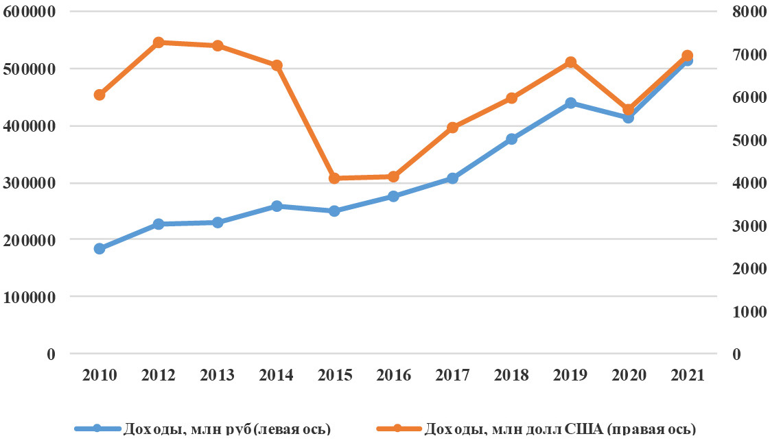Для проведения оценки бюджетной безопасности с точки зрения удовлетворения интересов государства в лице региональных органов власти, субъектов хозяйствования и населения предлагается использовать три показателя соответственно: исполнение бюджета региона по доходам и расходам, налог на прибыль организаций, поступивший в региональный бюджет, и среднедушевые доходы населения [27]. Отличительной особенностью арктических регионов является сырьевая направленность их экономик, а значит и экспортоориентированность продукции предприятий, функционирующих на их территориях. В этой связи финансовые результаты компаний, являющиеся источником бюджетных поступлений арктических регионов, существенно реагируют на изменение мировых цен на природные ресурсы и колебание курса рубля. В условиях усиления развития мировых экономических и политических процессов важна оценка динамики предложенных показателей не только в рублевом эквиваленте, но и в долларовом исчислении, чтобы определить «ценность» достигнутых результатов от проведения бюджетной политики в глобальном измерении.