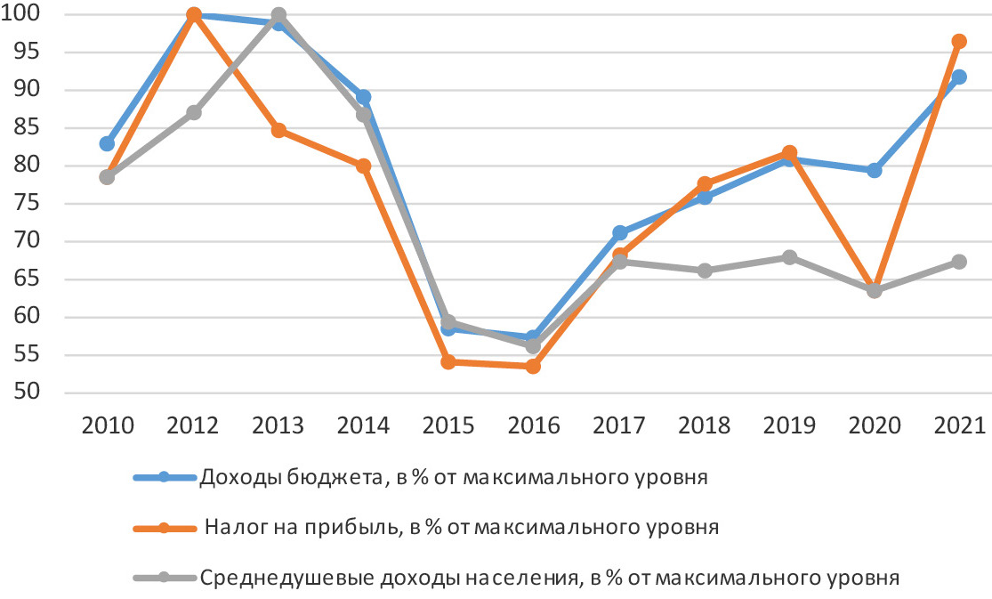 Figure 7. Dynamics of budget revenues, tax on profit and average per capita incomes, in % of their maximum level (in Russia).