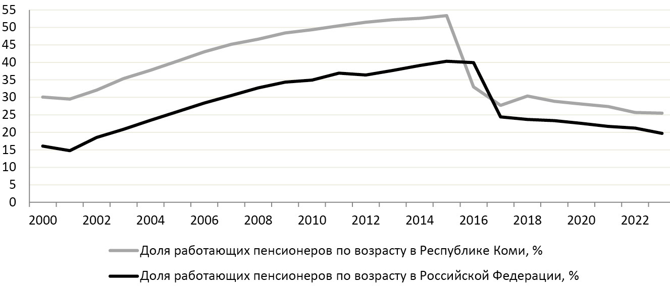 На протяжении 2000-х гг. доля работающих пенсионеров по старости в России устойчиво увеличивалась, достигнув в 2015–2016 гг. практически 40 % [19, с. 96–97]. В Республике Коми благодаря значительному количеству молодых пенсионеров в связи с льготным пенсионным возрастом занятость пенсионеров стабильно выше (рис. 1). В 2015 г. она достигла 53,3 %. Однако в 2016 г. произошло резкое снижение уровня занятости пенсионеров, очевидно, связанное со вступлением в силу Федерального закона № 385-ФЗ [33], который приостановил с 1 января 2016 г. индексацию пенсий работающим пенсионерам. Снижение доли работающих пенсионеров продолжается и в последующие годы, в том числе и после начала поэтапного повышения пенсионного возраста. На начало 2023 г. она составила в Коми 25,5 %, т. е. уменьшилась по сравнению с 2015 г. более чем в два раза.
