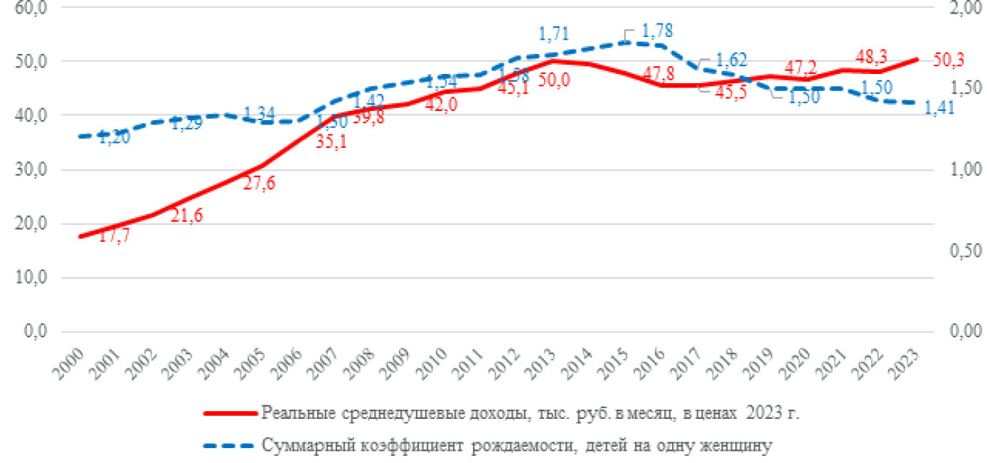 Рисунок 1. Динамика доходов и уровня рождаемости в Российской Федерации за 2000–2023 годы. Источник: рассчитано авторами по данным [12–15].