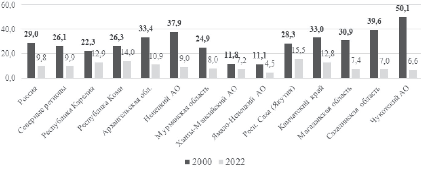 1 Под северными регионами нами понимаются субъекты России, территория которых, согласно Постановлению Правительства РФ от 16.11.2021 № 1946, полностью относится к районам Крайнего Севера или приравненным к нему местностям: Республики Карелия, Коми и Саха (Якутия), Камчатский край, Архангельская, Магаданская, Мурманская и Сахалинская области, Ханты-Мансийский, Ямало-Ненецкий, Ненецкий и Чукотский автономные округа. Из рассмотрения исключена Республика Тыва из-за резкой географической обособленности от остальных рассматриваемых регионов.