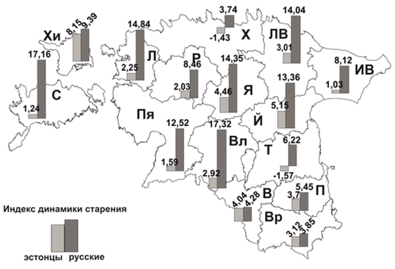 Индекс динамики старения также выше среди русского населения. Если среди русского населения ни в одном из уездов не наблюдается возрастной структуры с тенденцией омоложения, то среди эстонского населения в двух уездах страны возрастная структура имеет тенденцию спокойного омоложения (уезды Тартумаа и Харьюмаа). В 53 % уездах Эстонии возрастная структура русского населения характеризуется тенденцией несдержанного старения (уезды Хийумаа, Пярнумаа, Ляэне-Вирумаа, Йыгевамаа, Ляэнемаа, Ярвамаа, Вильяндимаа и Сааремаа), в то время как среди эстонского населения ни в одном уезде такой тенденции нет. В 80 % уездов возрастная структура эстонского этноса имеет характер медленного (уезды Ида-Вирумаа, Вильяндимаа, Сааремаа, Ляэнемаа, Пярнумаа, Рапламаа) и умеренного старения (Пылвамаа, Валгамаа, Йыгевамаа, Ярвамаа, Вырумаа и Ляэне-Вирумаа), в то время как среди русского населения тенденцию умеренного старения можно наблюдать только в 26 % уездов (Харьюмаа, Валгамаа, Вырумаа и Пылвамаа), а возрастной структуры с тенденцией медленного старения среди русского этноса и вовсе нет ни в одном из уездов страны. Данные по индексу старения и индексу динамики старения без привязки к этнической принадлежности приведены на рис. 3.