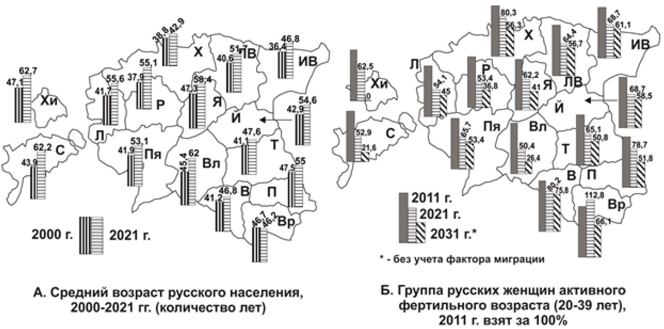 Как показали расчеты, в период с 2011 по 2021 г. доля русского населения Эстонии в возрастных группах 20–29 и 30–39 лет сократилась в среднем на 6 %. В указанных возрастных группах максимальное сокращение численности русских происходило в уездах Вильяндимаа (на 49,6 %), Рапламаа (46,6), Ляэнемаа (45,9 %). Достаточно высокими также были темпы сжатия данных возрастных групп у русских в уездах Ляэне-Вирумаа (35,6) и Тартумаа (34,9 %).