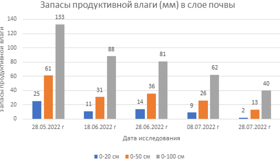 Согласно данным Уральского управления по гидрометеорологии и мониторингу окружающей среды (рисунок), запасов продуктивной влаги в почве на период посева и во время вегетации было недостаточно [4]. Вместе с тем на уровень урожайности подсолнечника оказали положительное влияние прошедшие в марте дожди.