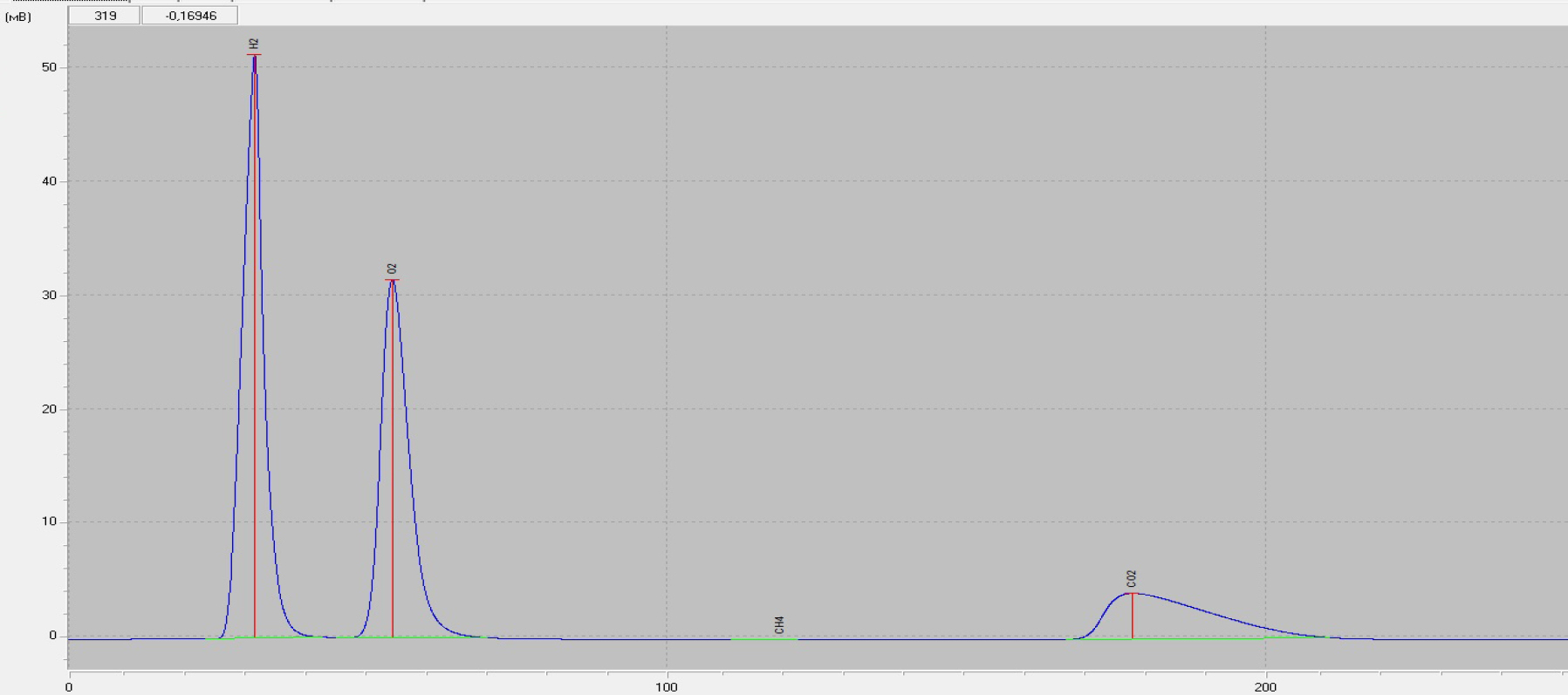 Figure 1. Chromatogram of seed metabolism gaseous products. The central peak corresponds to oxygen O2, the left peak corresponds to hydrogen H2, the right peak corresponds to carbon dioxide gas CO2.