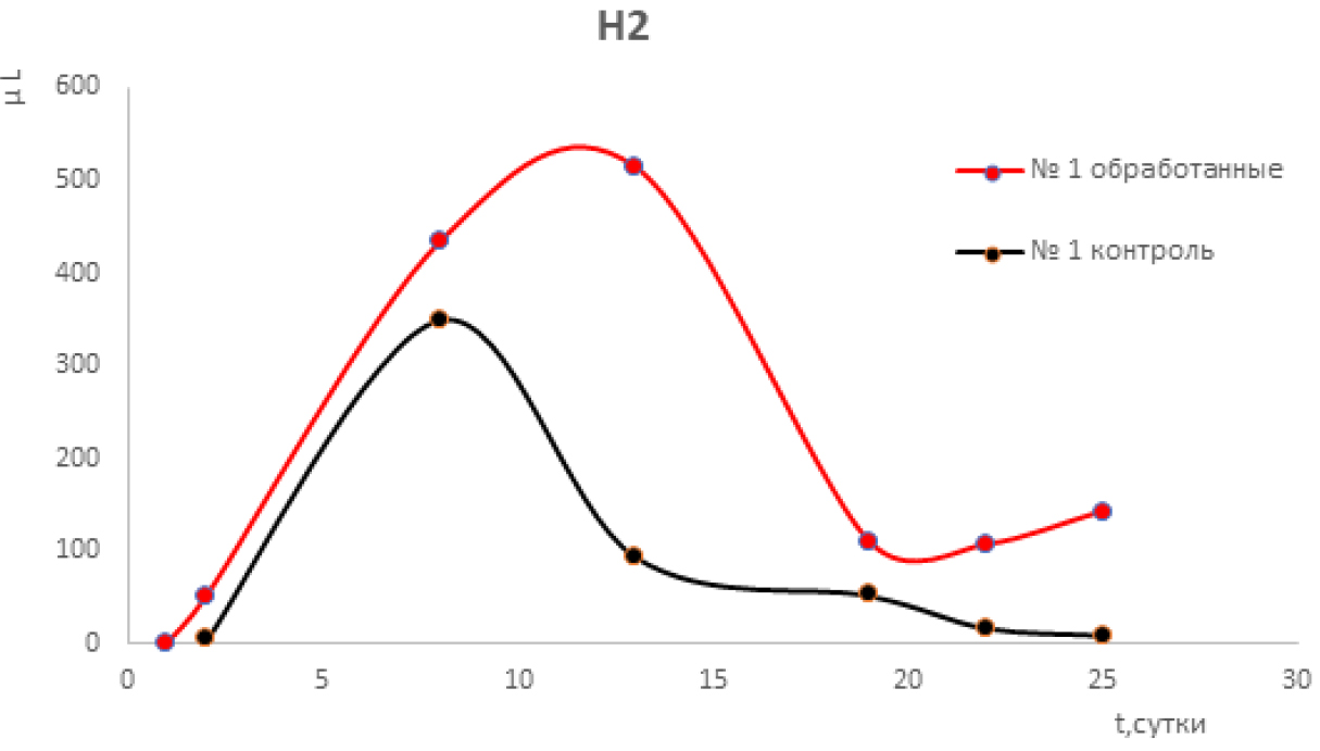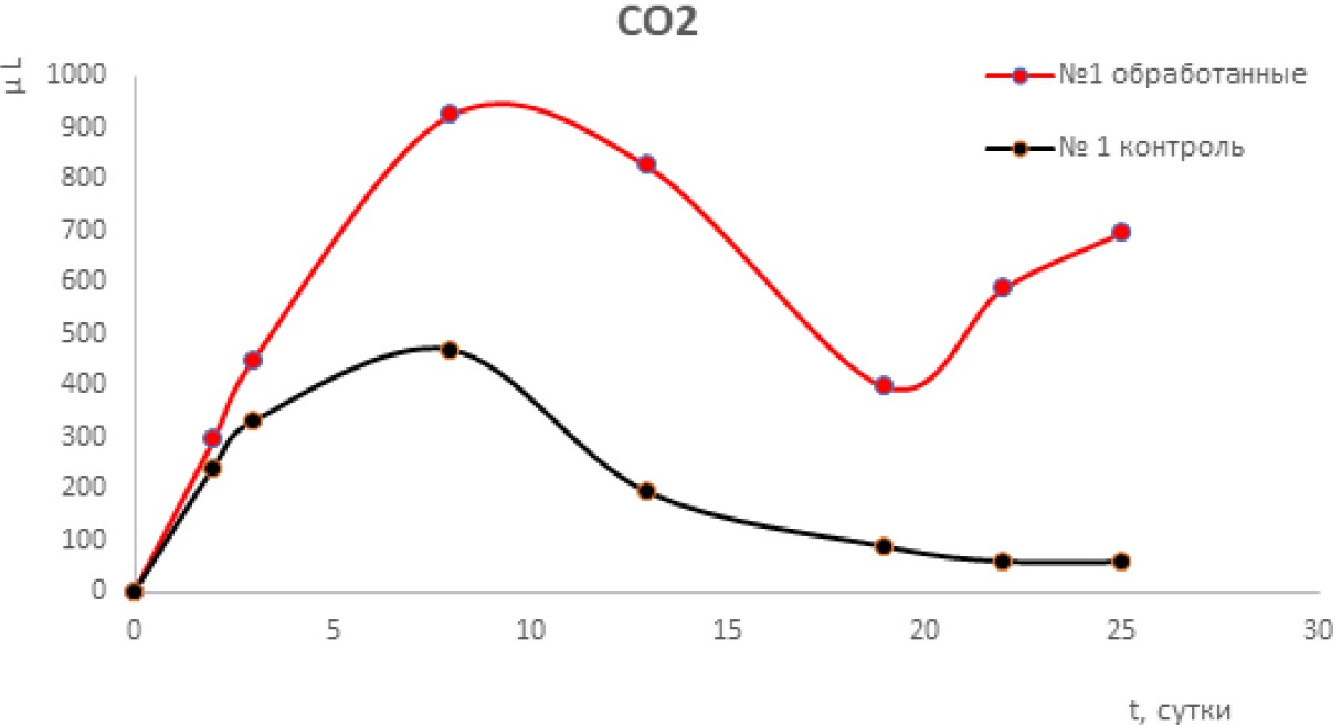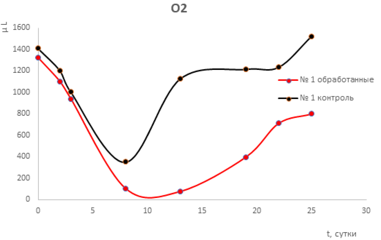 На примере образцов «1-обработанный» и «1-контроль» решалась следующая задача: проследить за изменением состава газовой фазы в контейнерах с семенами гороха со временем. Для этого в контейнеры сначала вносили воду (1 мл ежедневно), затем по мере снижения содержания кислорода вместе с водой вводили воздух (от 2 до 4 мл, каждые восьмые сутки).