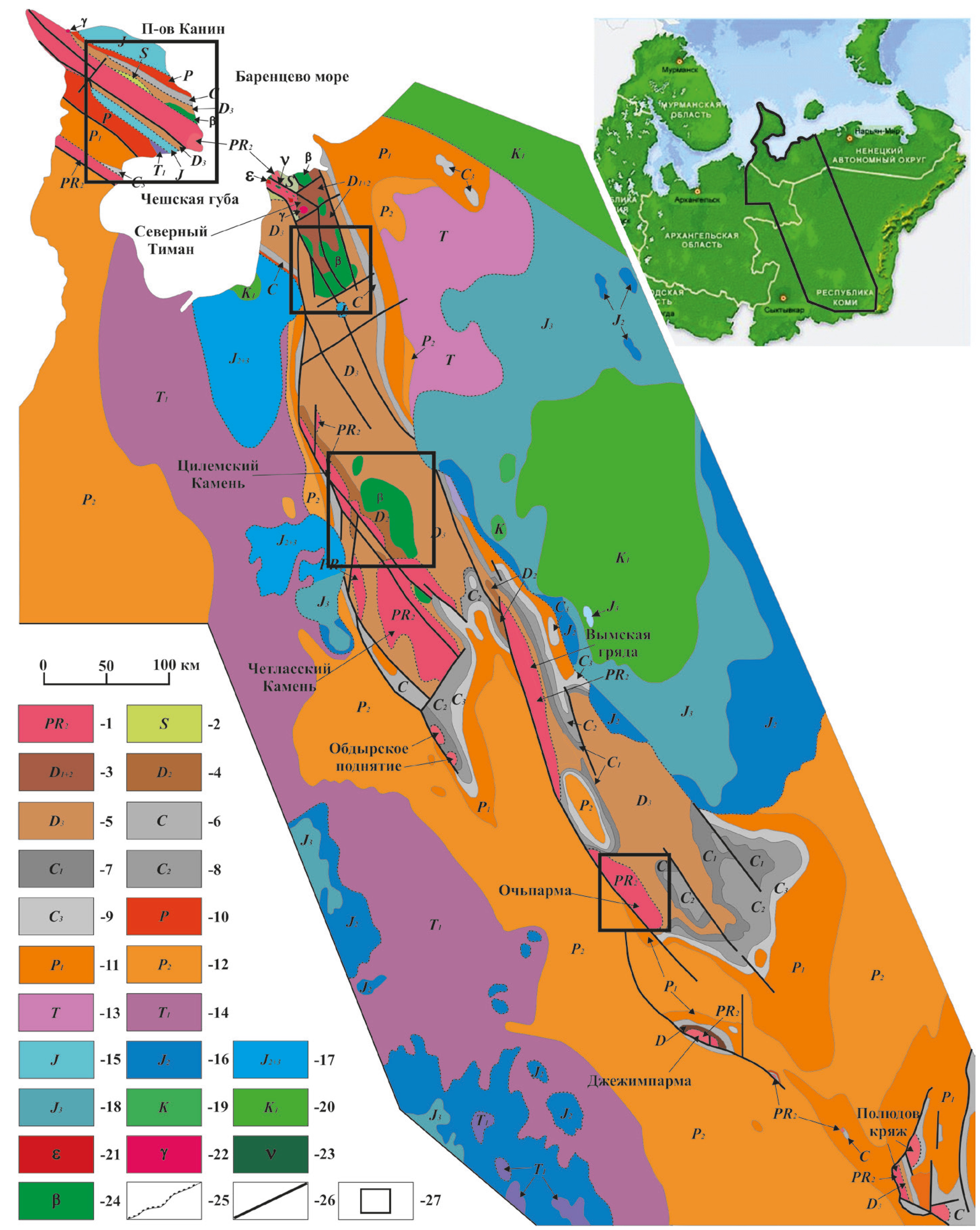 Figure 1. Geological sketch-map of the Timan and the Kanin Peninsula (according to [1]): 1 – Upper Proterozoic (PR2); 2 – Silurian (S); 3 – Lower and Middle Devonian (D2-3); 4 – Middle Devonian (D2); 5 – Upper Devonian (D3); 6 – Carboniferous (C); 7 – Lower Carboniferous (C1); 8 – Middle Carboniferous (C2); 9 – Upper Carboniferous (C3); 10 – Permian (P); 11 – Lower Permian (P1); 12 – Upper Permian (P2); 13 – Triassic (T); 14 – Lower Triassic (T1); 15 – Jurassic (J); 16 – Middle Jurassic (J2); 17 – Middle and Upper Jurassic (J2-3); 18 – Upper Jurassic (J3); 19 – Cretaceous (K); 20 – Lower Cretaceous (K1); 21 – syenites (ε); 22 – granitoids (γ); 23 – dolerites (ν); 24 – basalts (β); 25 – unconformable bedding; 26 – faults; 27 – research areas.