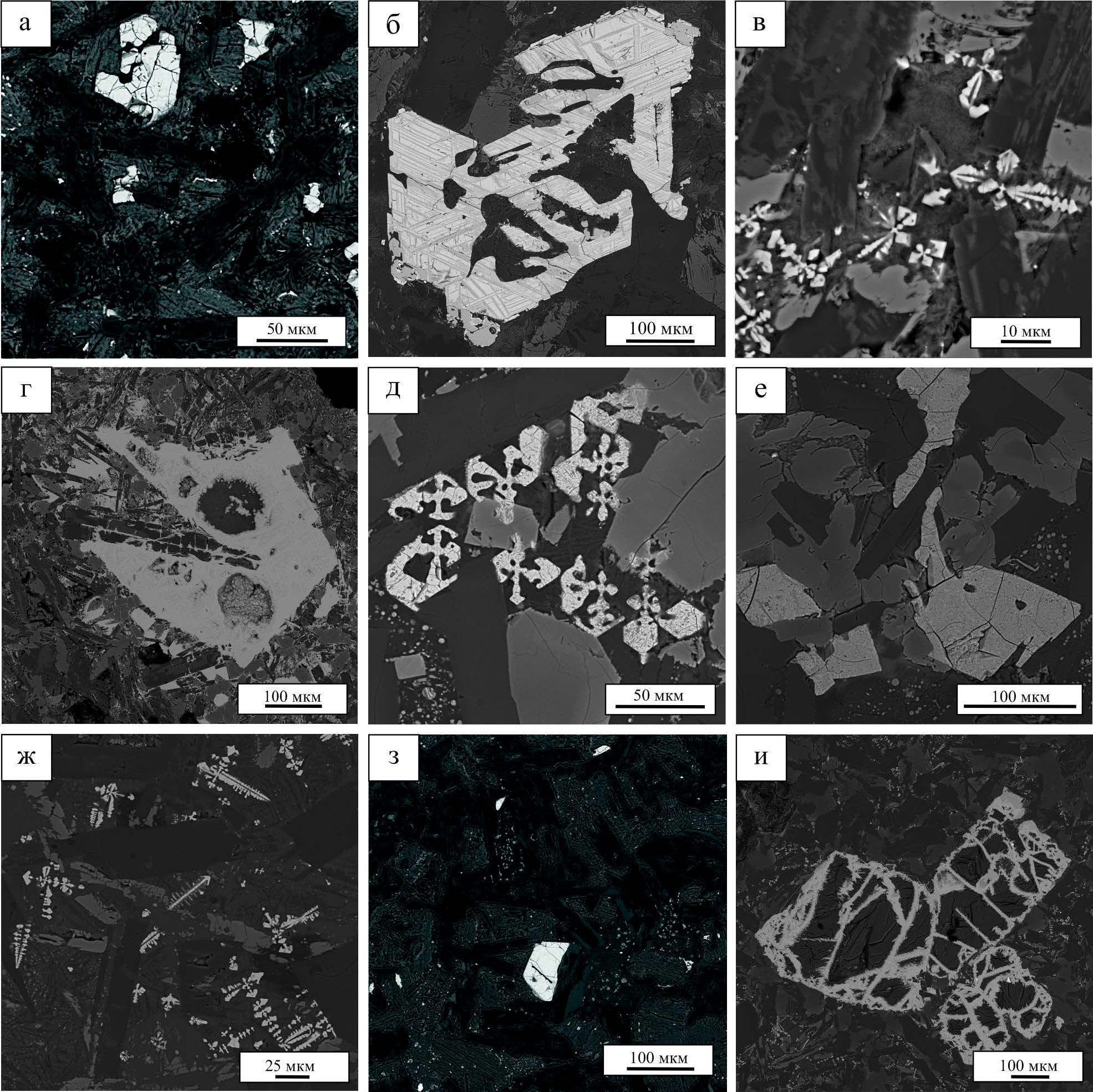 Рисунок 2. Кристаллы титаномагнетита: а, б – полуостров Канин: а – гомогенные эвгедральные кристаллы, б – скелетные кристаллы со структурой распада; в, г – Северный Тиман: в – скелетные кристаллы, г – гидроксиды железа; д, е – Средний Тиман: д – скелетные кристаллы, е – эвгедральные кристаллы; ж-и – Южный Тиман: ж – скелетные кристаллы, з – эвгедральные кристаллы, и – гидроксиды железа (фото в обратно рассеянных электронах).