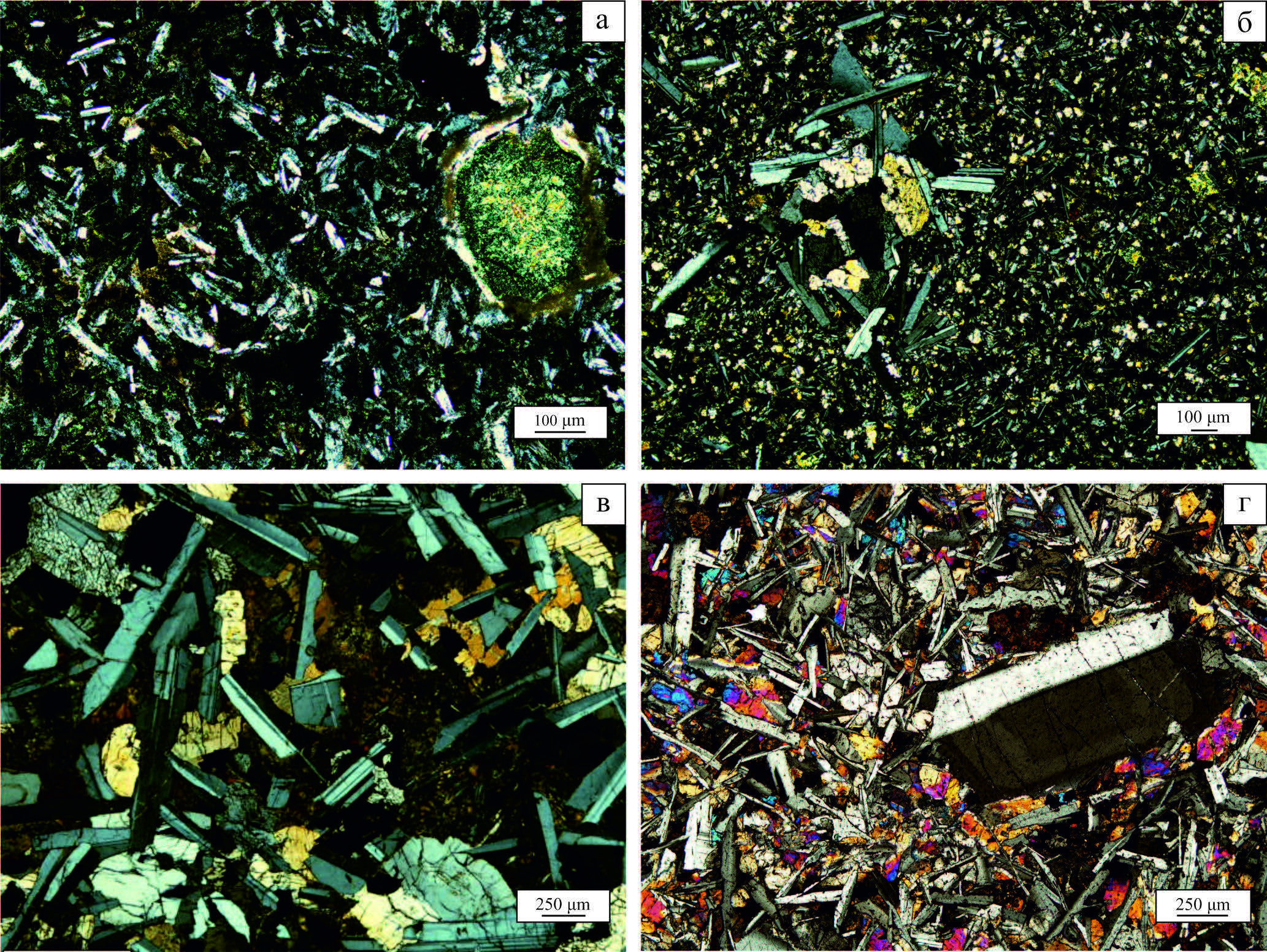 Рисунок 3. Микрофотографии шлифов пород полуострова Канин: a, б – базальты юго-восточной части: а – миндалекаменные базальты; б – пойкилоофитовая структура; в, г – долериты: в – порфировая структура в долеритах юго-восточной части; г – порфировые вкрапленники плагиоклаза в долеритах центральной части.