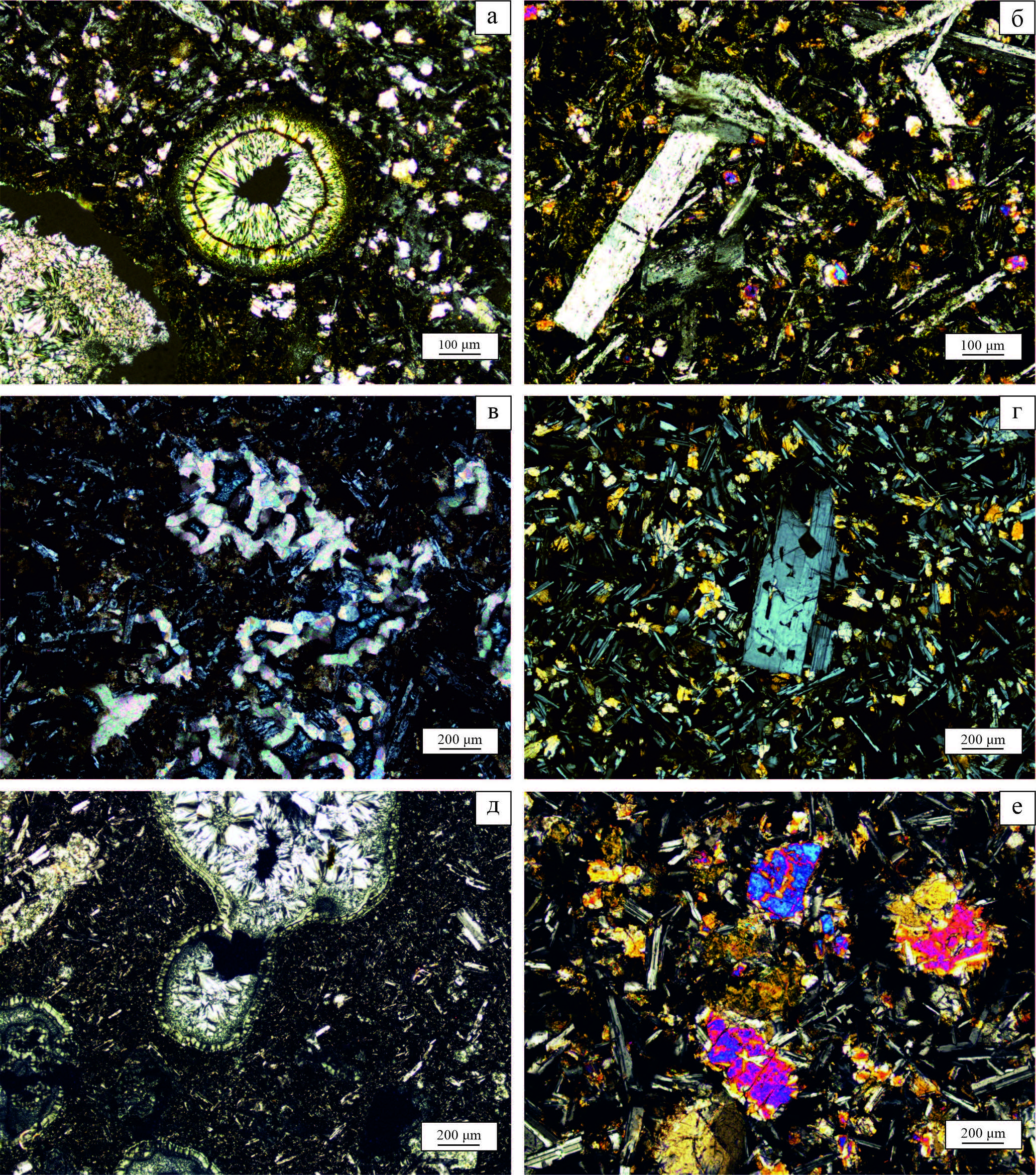 Рисунок 4. Микрофотографии шлифов: a, б – базальты Северного Тимана (реки Сула, Белая): a – миндалекаменные базальты, б – порфировые вкрапленники плагиоклаза; в, г – базальты Среднего Тимана (р. Цильма): в – амебовидные миндалины в базальтах, г – порфировые вкрапленники плагиоклаза; д, е – базальты Южного Тимана (скв. 10): д – миндалекаменные базальты, е – зерна пироксена и лейсты плагиоклаза в базальтах.