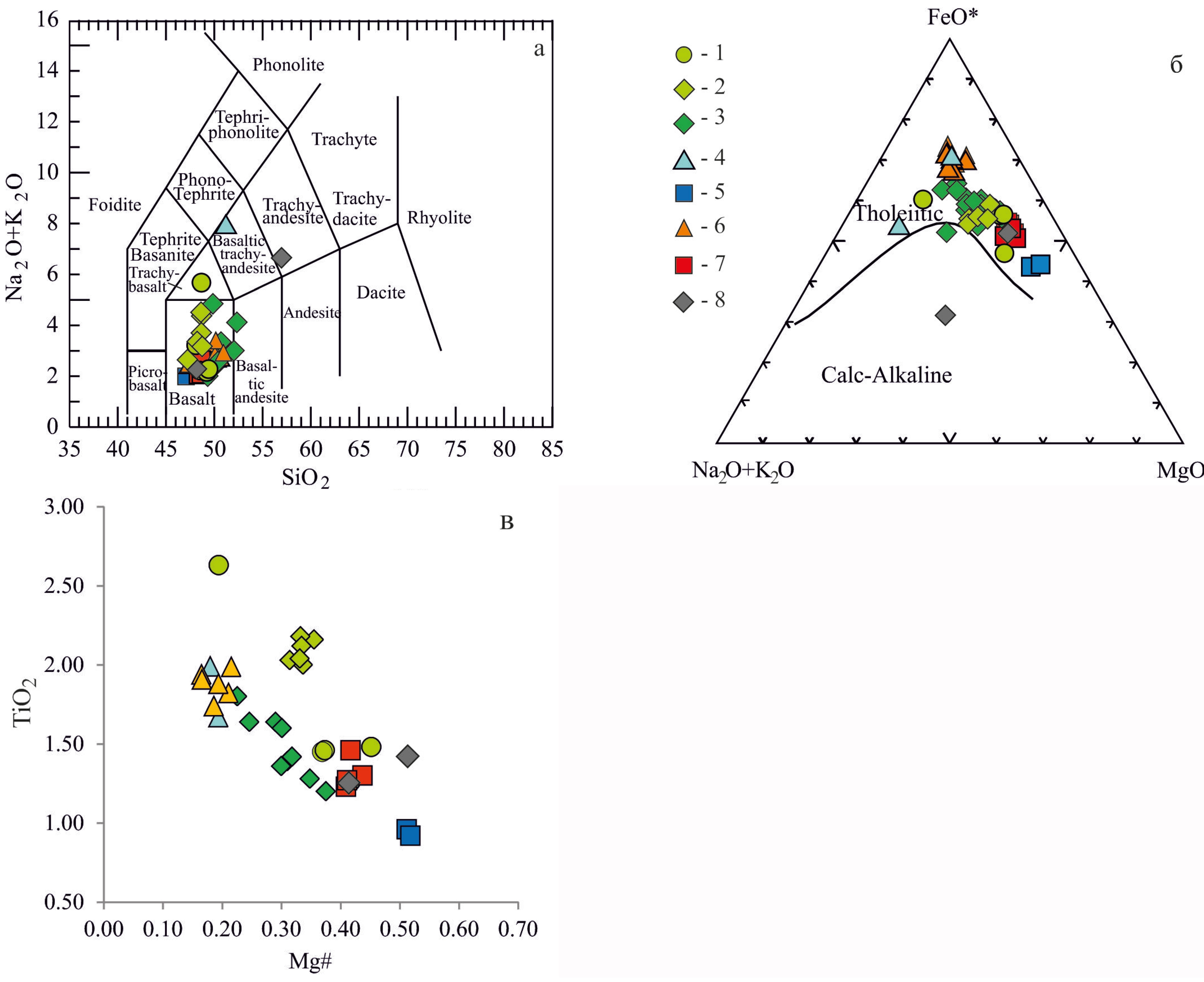 Рисунок 5. Классификационные диаграммы для магматических пород основного состава Тимана и полуострова Канин: а – диаграмма (Na2O+K2O–SiO2) [13]; б – диаграмма AFM [14]; в – вариационная диаграмма TiO2 – Mg#.