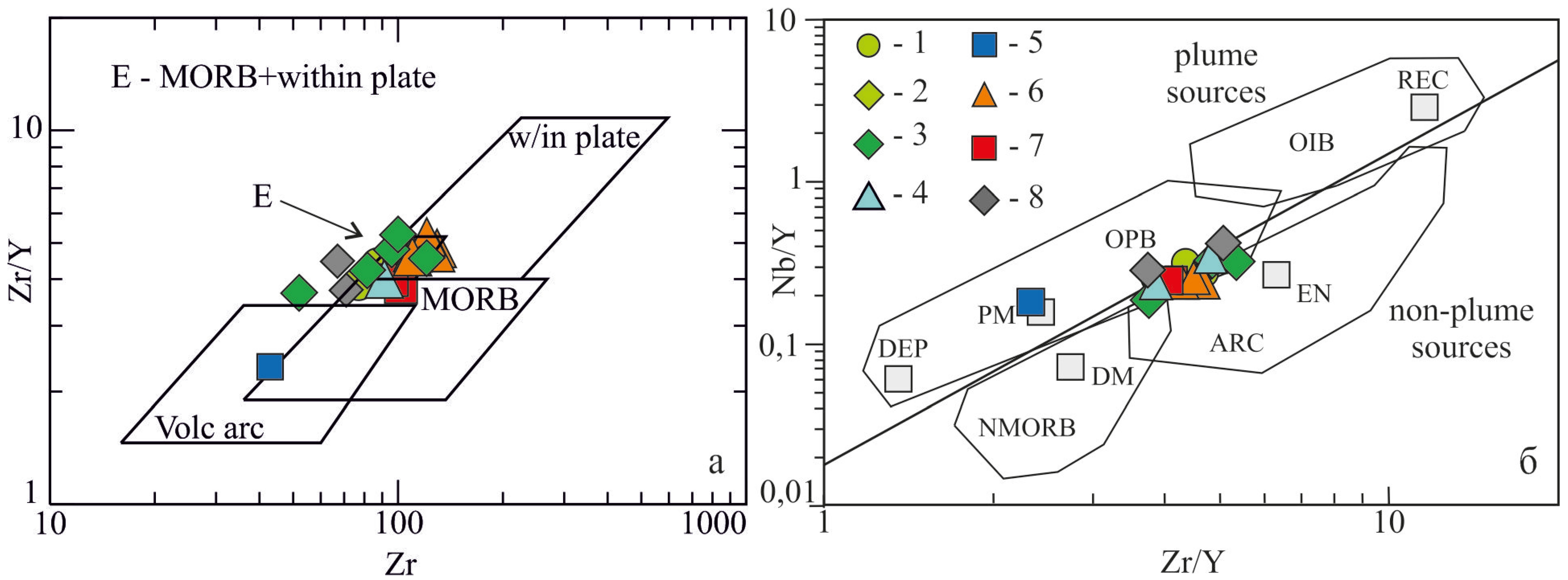 Рисунок 7. а - диаграмма Zr/Y – Zr: w/in plate – внутриплитные толеиты, MORB – базальты СОХ, Е – внутриплитные толеиты и базальты СОХ, volc arc – островодужные базальты [18]; б – диаграмма Zr/Y–Nb/Y: DEP – деплетированная глубинная мантия, PM – примитивная мантия, OPB – базальты океанического плато, OIB – базальты океанических островов, REC – рециклинированный компонент, NMORB – нормальные базальты срединно-океанических хребтов, DM – верхняя деплетированная мантия, ARC – островодужные базальты, EN – обогащенный компонент [19, 20].