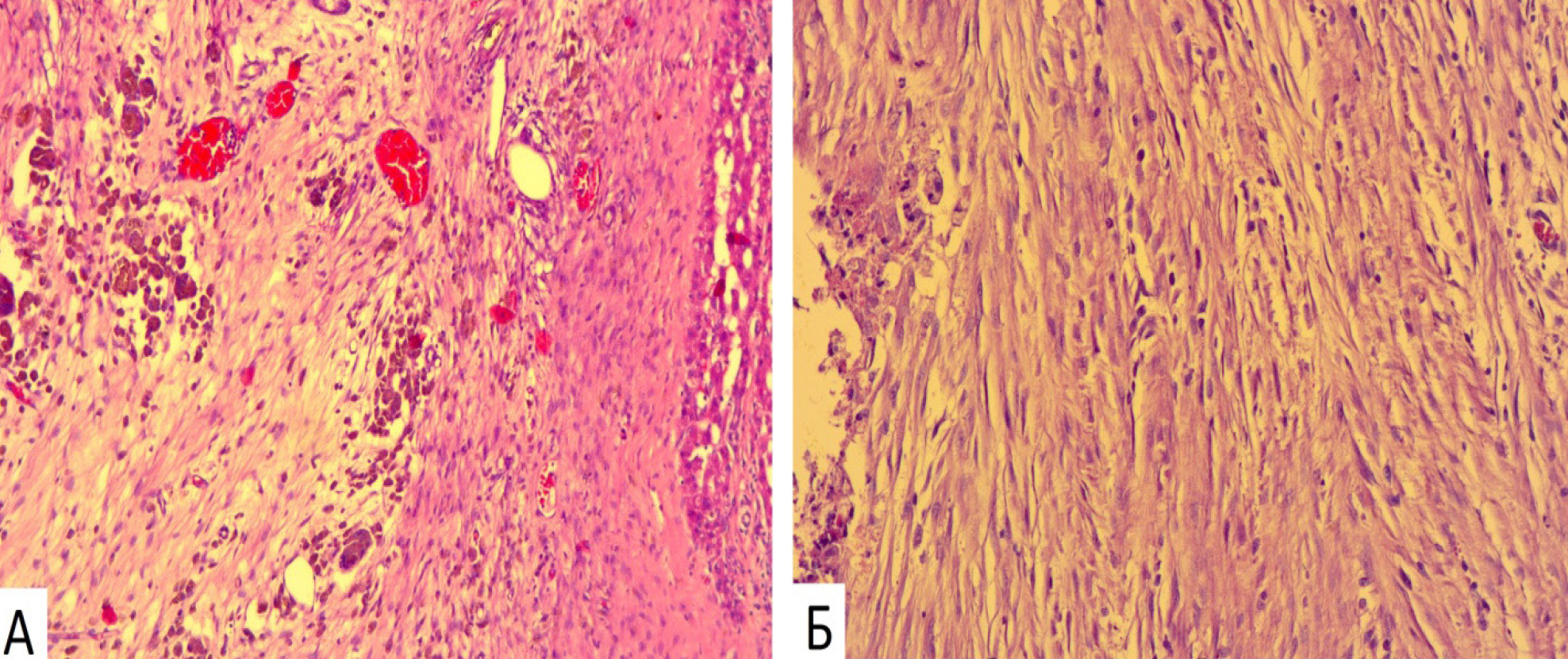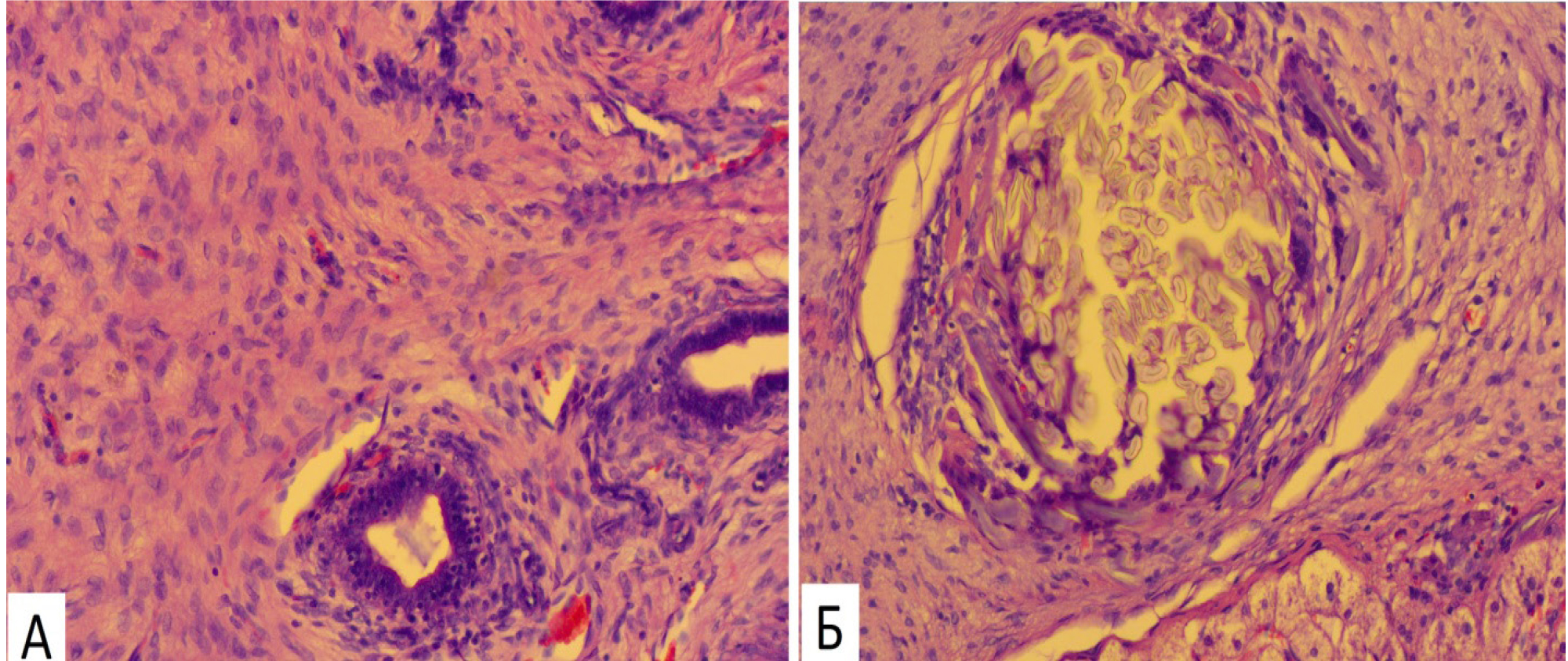 На 14-е сутки эксперимента (ОГ) в формирующейся рубцовой ткани вокруг молселекта G-50 отмечались многочисленные многоядерные гигантские клетки инородных тел (рис. 5А). В это же время в КГ формирующаяся соединительнотканная капсула имела незначительное количество гигантских клеток на рассасывание инородных тел (рис. 5Б).