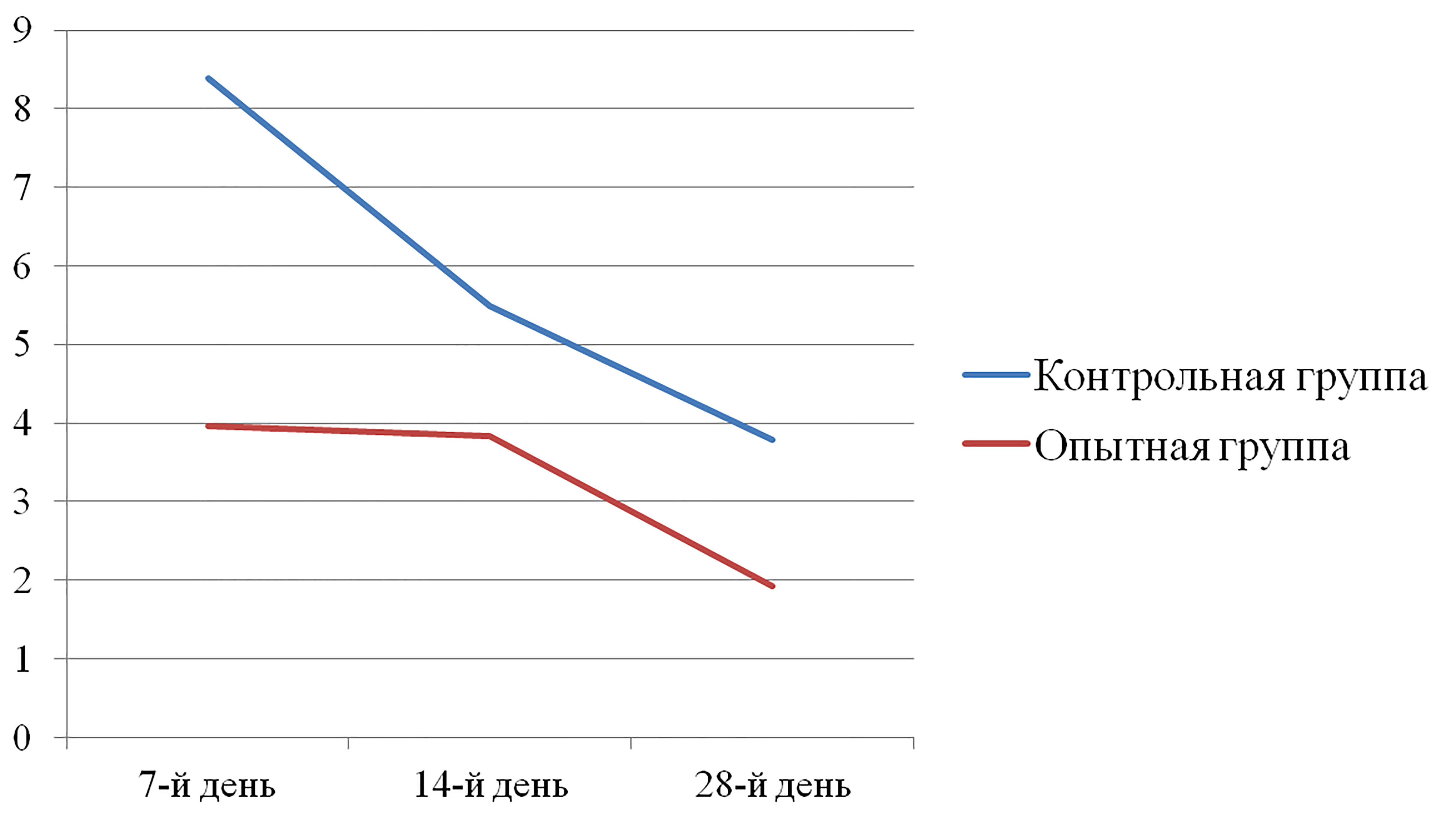 При сравнении этих показателей выявлено статистически достоверное различие ИА на 7-й день экспериментального исследования: ИА в ОГ составил 3,96 ± 1,21, в КГ – 8,39 ± 2,46 (P < 0,05). Наиболее вероятно ИА в КГ на 7-й день был выше из-за ишемических процессов в области контрольных ран, что связано со сдавлением шовным материалом кровоснабжающих зону повреждения сосудов. В ОГ на 14-е сутки ИА находился на уровне 7 дня – 3,83 ± 1,22 (P < 0,05), а к 28-му дню происходило его значительное снижение до уровня 1,92 ± 0,78. В КГ к 14-му дню ИА снижался с 8,39 ± 2,46 до 5,49 ± 1,61 (P < 0,05), а к 28-му дню ИА продолжил снижение и составил 3,78 ± 0,88. Значимость различий ИА в сравниваемых группах на 28-е сутки составила P = 0,001.