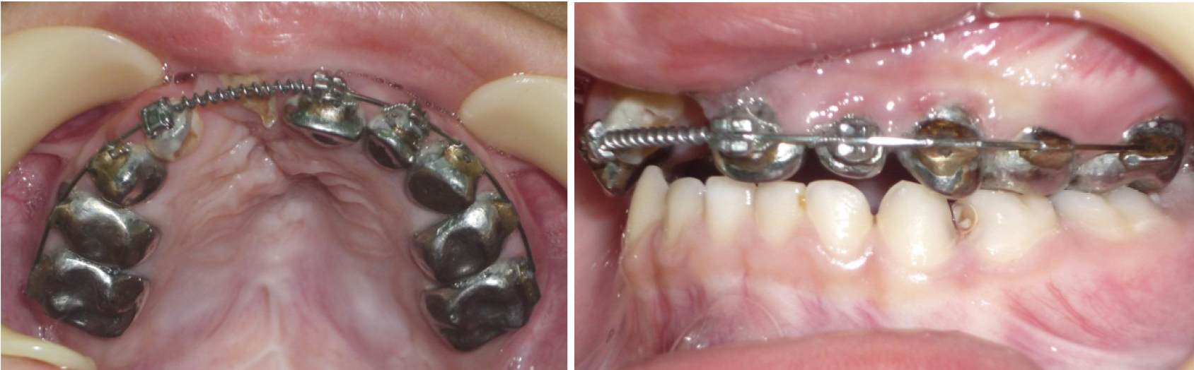 Лечение проводилось с применением несъемной дуговой аппаратуры. Фиксирующими элементами служили тонкостенные коронки (кольца) с припаянными вестибулярными брекетами. Размер металлической дуги определяли с помощью предложенных методов графического анализа (рис. 3). Металлические дуги меняли с учетом протокола лечения эджуайс-техникой до нормализации формы арки, соответствующей прогнозируемым размерам. После нормализации окклюзионных взаимоотношений аппарат использовался в качестве ретенционного до смены молочных зубов постоянными (рис. 4).