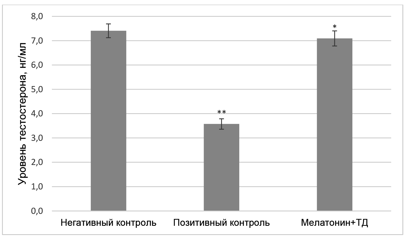 Эти изменения способствовали снижению уровня тестостерона в сыворотке крови на 51,4 % (p < 0,001), что приводило к нарушению андрогензависимых функций, включая репродуктивную. Введение экзогенного мелатонина в течение 14 сут. привело к повышению уровня тестостерона в сыворотке крови в 1,97 раза (рис. 2).