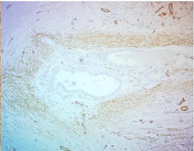 ИГХ-исследование выявило положительную экспрессию гладкомышечного актина в фокусах фиброза вокруг и между очагами экстрагенитального эндометриоза. Гладкомышечный актин экспрессировался в миофибробластах, концентрически расположенных вокруг эндометриоидных гетеротопий по типу «муфт» (рис. 3).