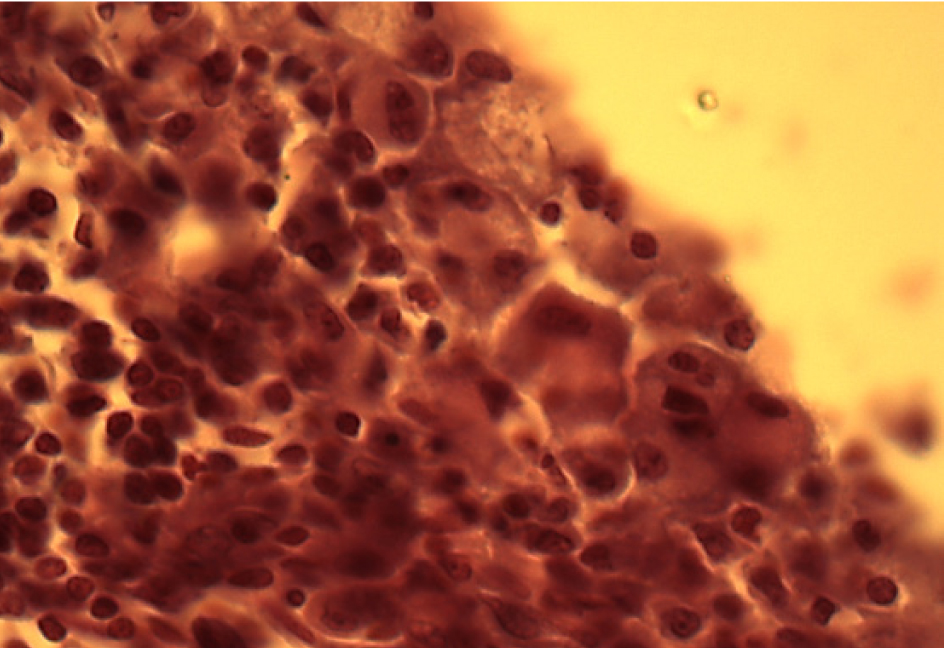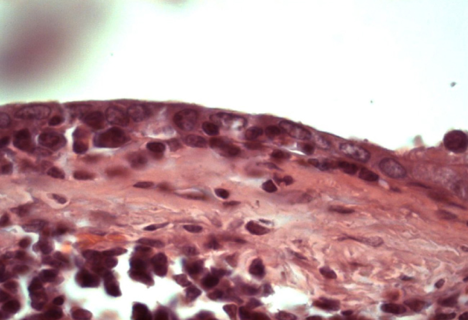 Рис. 8. Образование однослойного плоского эпителия, замещающего участки повреждения. Окраска гематоксилином и эозином. Ок. 10. Об. 100. Иммерсия