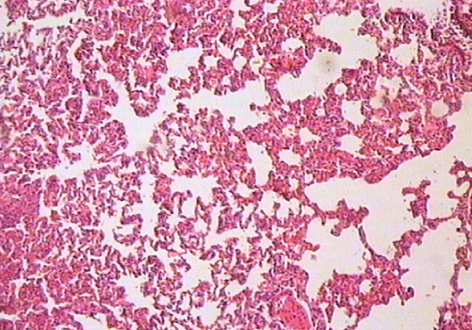 Выделенные кусочки легких фиксировали в 10%-м нейтральном формалине и заливали в парафин. Серийные парафиновые срезы толщиной 5–7 мкм окрашивались гематоксилином и эозином [8], по способам Маллори, Массона и муцикармином Мейера [9].