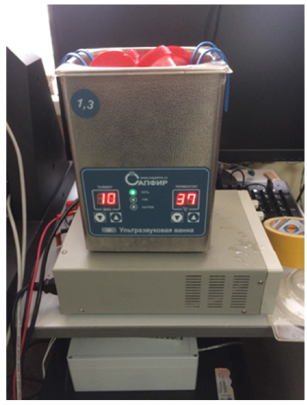 В рамках проводимых исследований на территории Федерального государственного бюджетного научного учреждения «Технологический институт сверхтвердых и новых углеродных материалов» разработано устройство для проведения термоциклирования испытуемых образцов. Устройство состоит из двух моторизованных переводчиков на шаговых двигателях, которые управляются с компьютера. Имеется два стакана воды для имитации состояния полости рта. Первый стакан – «горячий», со средней температурой 60 °С, второй стакан – «холодный», со средней температурой 5 °С. Возможное отклонение температуры составляет 1 °C (рис. 2).