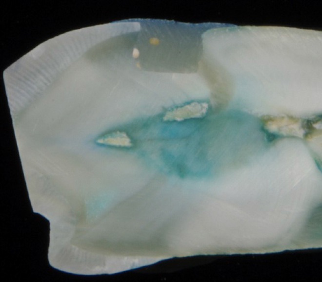 На следующем этапе исследования образцы зубов были разрезаны по сагиттали для изучения глубины проникновения красящего вещества между реставрациями (вкладками и пломбами) и стенкой зуба. В процессе выполняемой работы велся фотопротокол каждого этапа. Фотографии выполнены при увеличении в 20 раз.