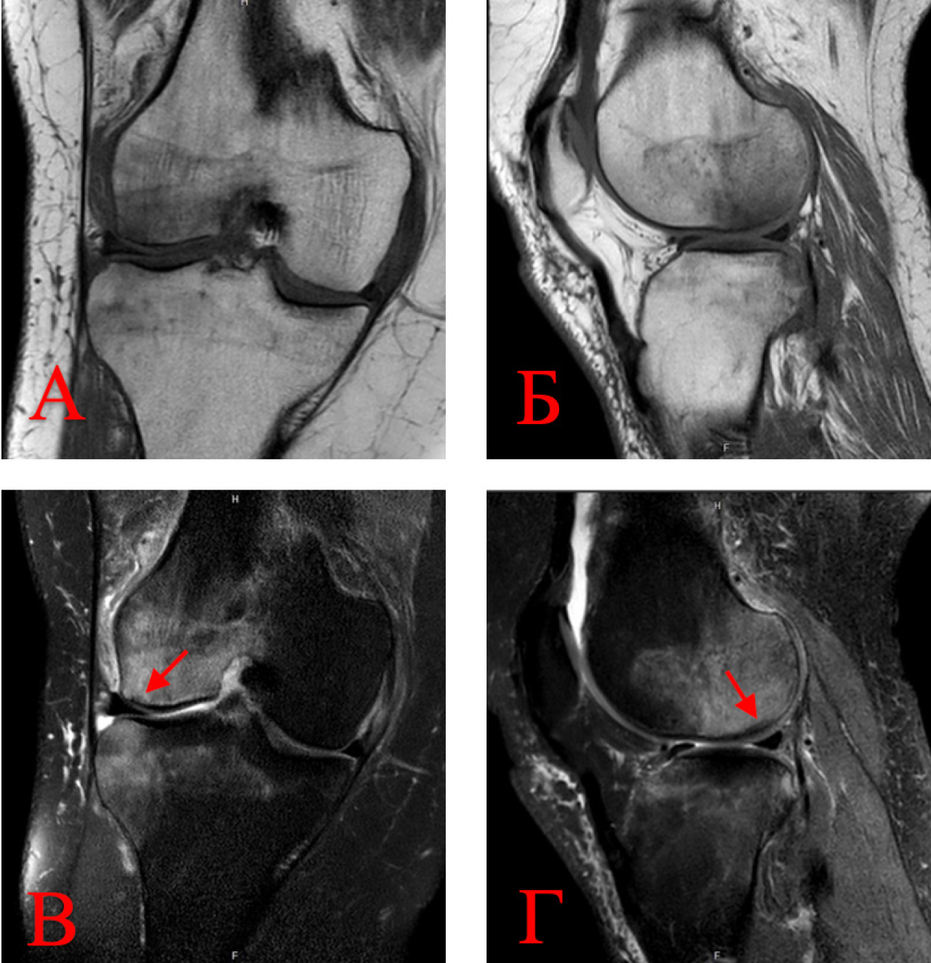 Рис. 1. МРТ-картина асептического некроза и выраженного трабекулярного отека мыщелков бедренной и большеберцовой костей: А, Б – T1-взвешенные изображения; В, Г – T2-взвешенные изображения с подавлением жира. Стрелками обозначен формирующийся остеонекротический очаг