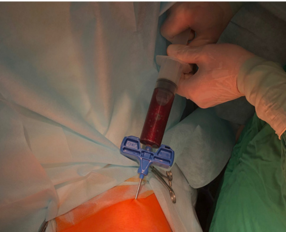 Соблюдая меры асептики и антисептики, в положении пациента лежа на животе, с использованием 2%-го раствора «Лидокаина», проводили местную анестезию кожи и подлежащих мягких тканей области передней верхней ости подвздошной кости до контакта инъекционной иглы с поверхностью кортикальной пластинки. Узким лезвием скальпеля, путем прокола, выполняли операционный доступ длиной 2 мм на вершине пальпируемой ости подвздошной кости. Острие аспирационного троакара (11G) помещали на середину кортикальной площадки ости подвздошной кости. Надавливая на рукоятку троакара, его острие вращательными движениями проводили через кортикальную пластинку на глубину 35–50 мм. После чего осуществляли забор костного мозга в объеме 90 мл (рис. 2).
