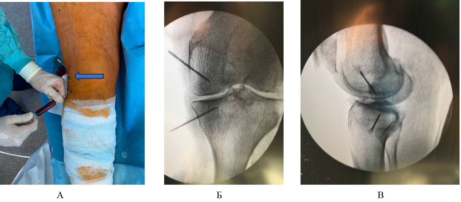 Рис. 4. Расположение троакаров при внутрикостном введении АККМ в область мыщелков бедренной и большеберцовой костей: А – расположение троакаров относительно уровня суставной щели (синяя стрелка); Б, В – позиционирование троакаров в прямой и боковой проекциях под контролем ЭОП