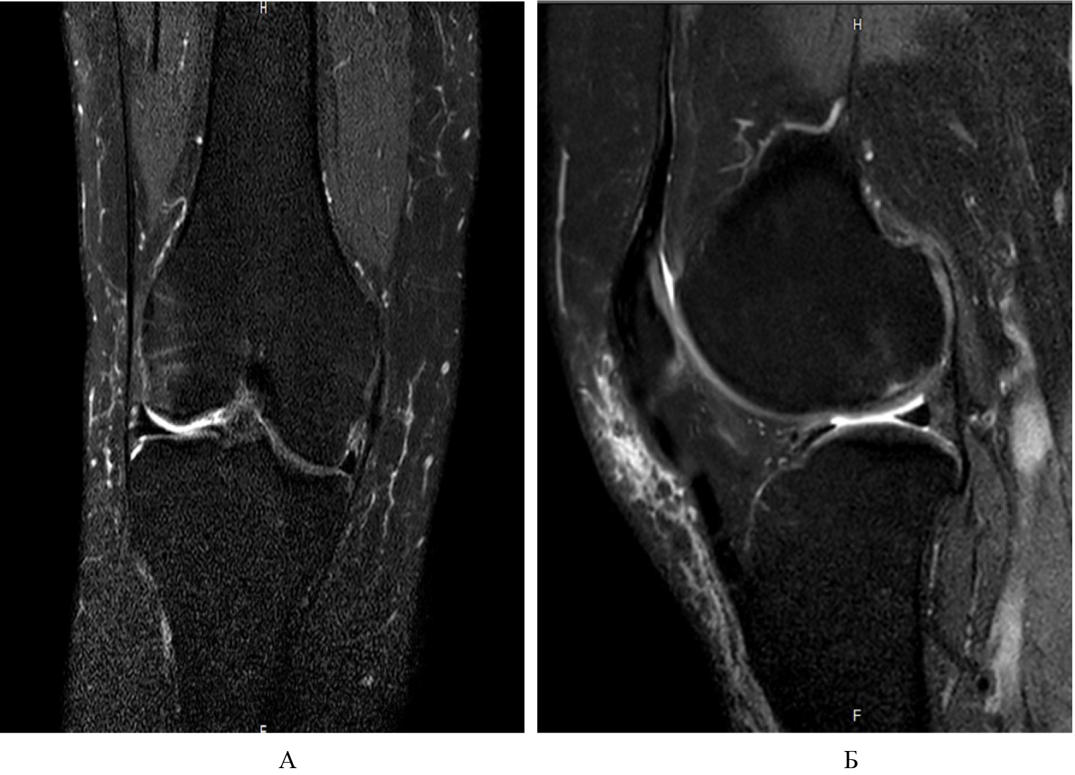 Рис. 5. Регресс признаков ишемии и трабекулярного отека костного мозга: А, Б – прямая и боковая проекции на Т2-взвешенных изображениях
