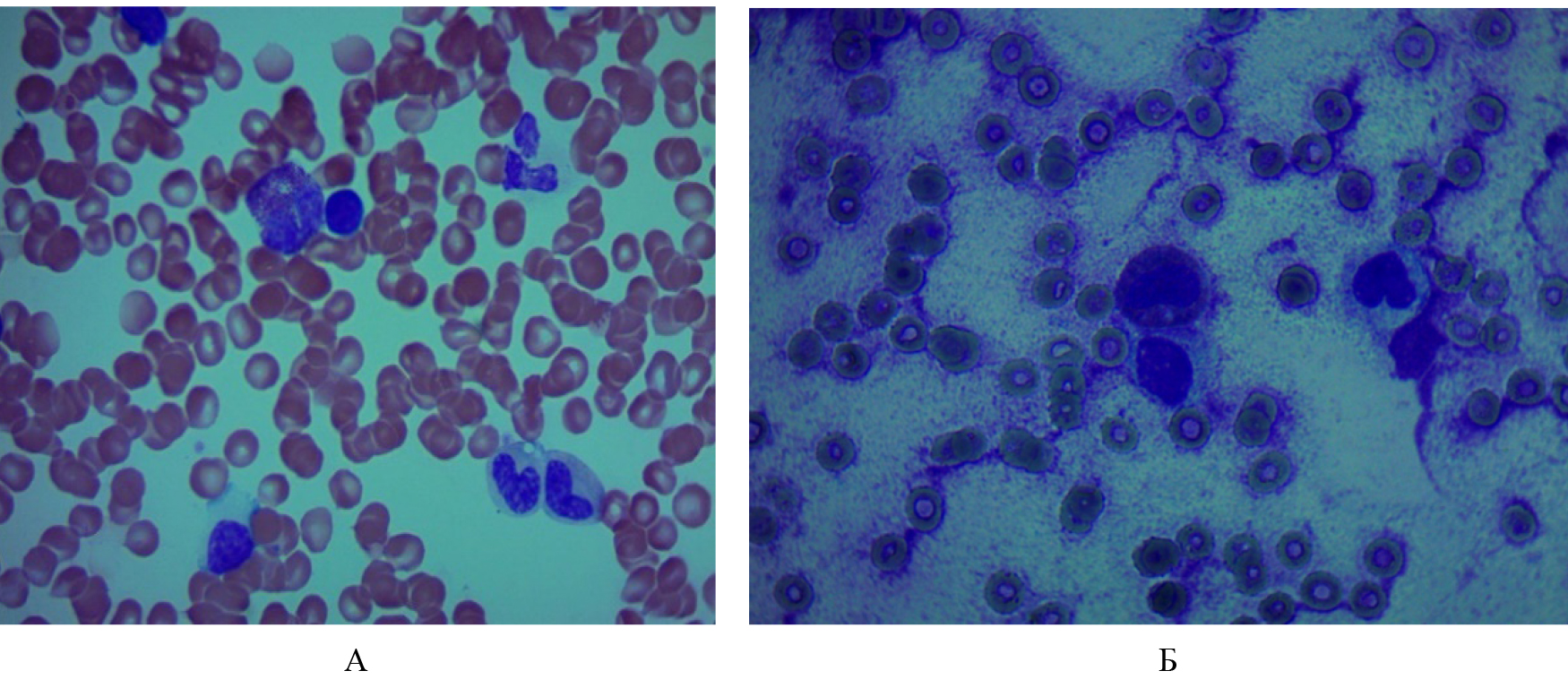 Рис. 6. Микроскопия образцов: А – мазок аспирата до центрифугирования; окраска по Романовскому – Гимзе; ув. ×1000; Б – мазок супернатанта после центрифугирования; окраска по Романовскому – Гимзе; ув. ×1000