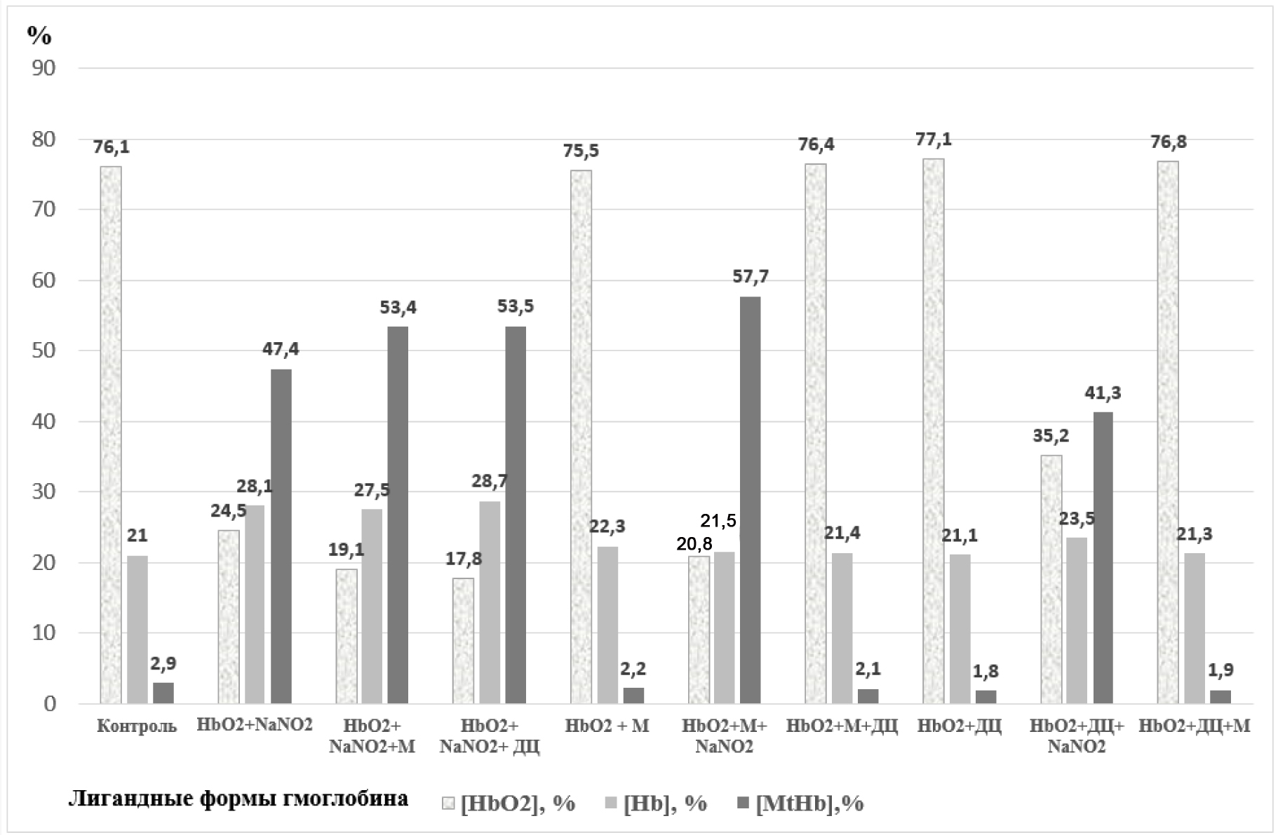 На основании исследования спектральных характеристик растворов оксигемоглобина человека, модифицированных ДЦ, мексидолом и нитритом натрия, установлено изменение соотношения лигандных форм гемопротеида в растворе (рис. 4).