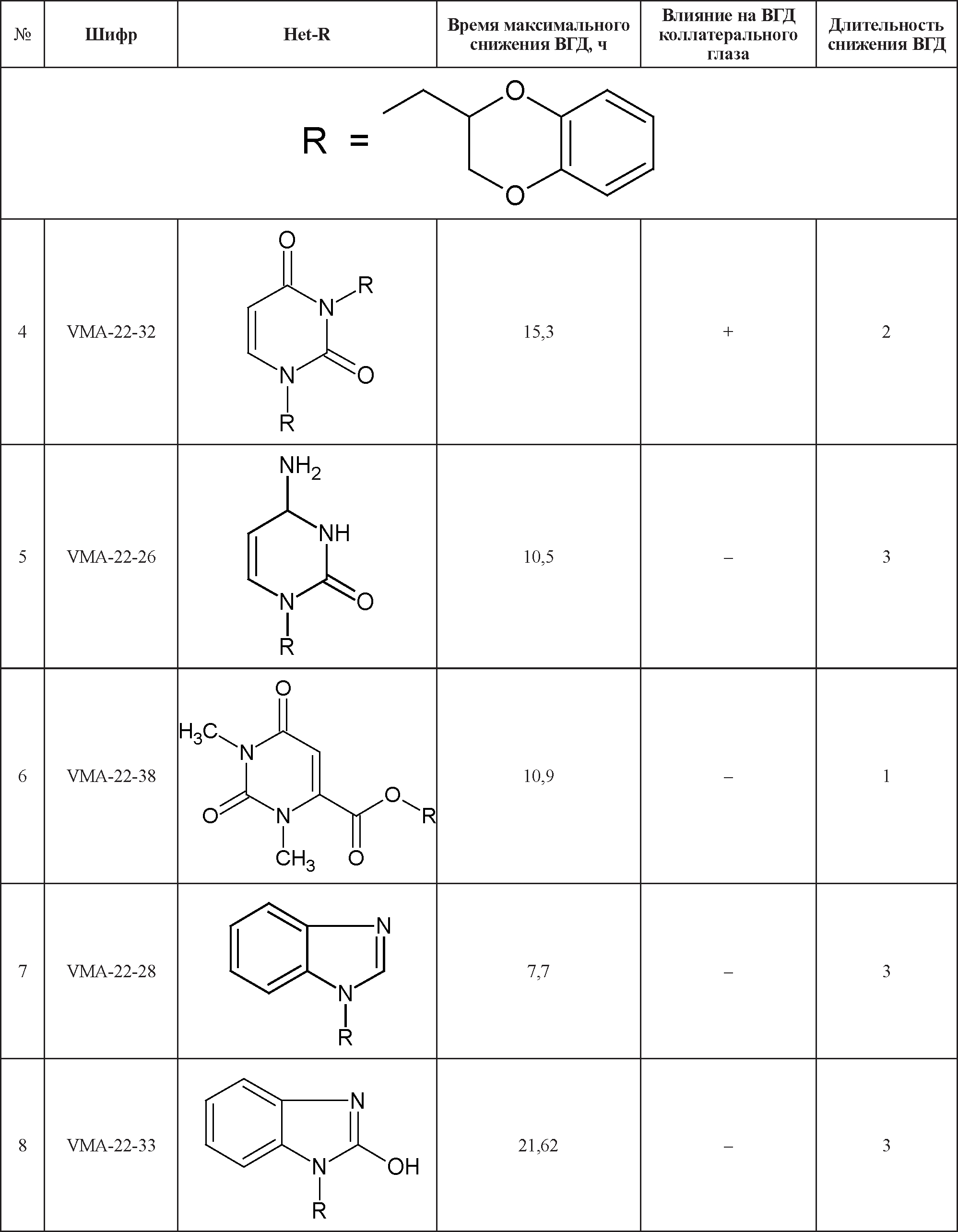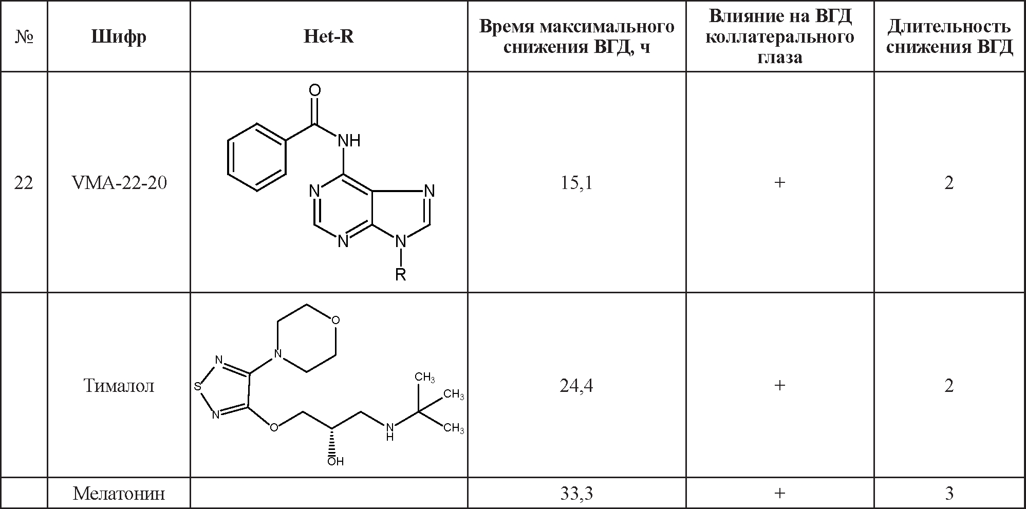 При изучении влияния синтезированных изостеров мелатонина на ВГД было выявлено, что все синтезированные производные (бензодиоксан-2-ил)метанола по снижающей активности ВГД уступают мелатонину. При этом в большей степени снижали уровень ВГД соединения, содержащие в своей структуре бензимидазольную и пуринергическую гетероциклическую системы. Наименьшую активность проявили соединения, имеющие в своей структуре хинозолиновую гетероциклическую систему. Из 19 соединений наиболее эффективно снижало ВГД, на 26,6 %, соединение VMA 22-37, превосходя по своей активности тимолол и практически не уступая мелатонину. Так, тимолол снижал ВГД уже через 30 мин после введения на 24,4 %, мелатонин при инстилляции снижал офтальмотонус на 33,3 %.