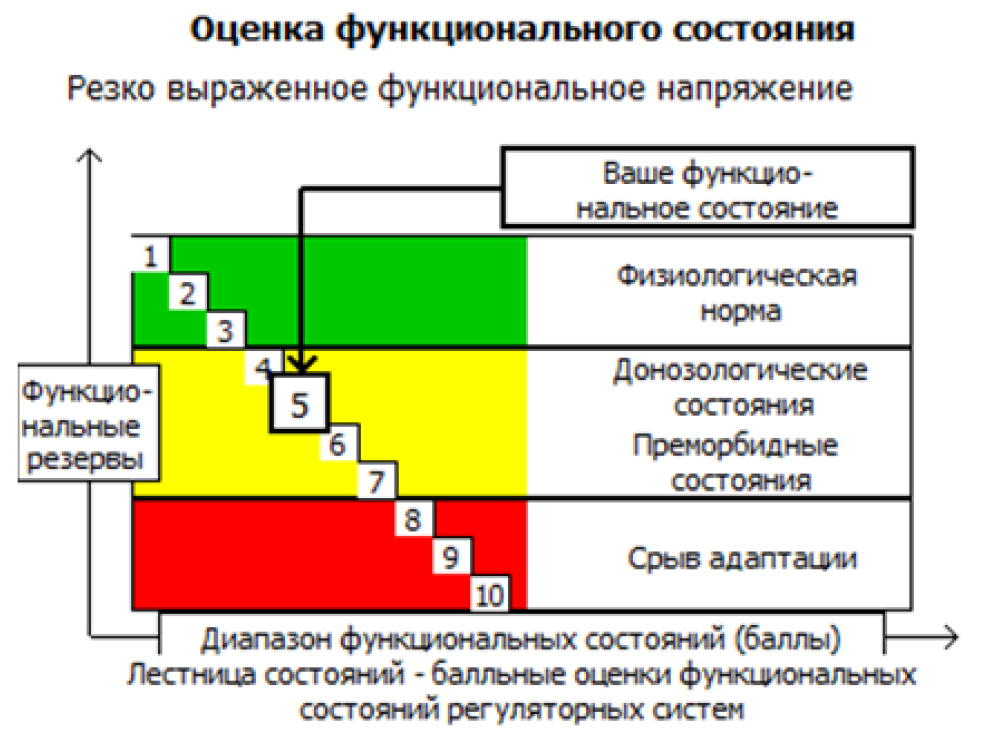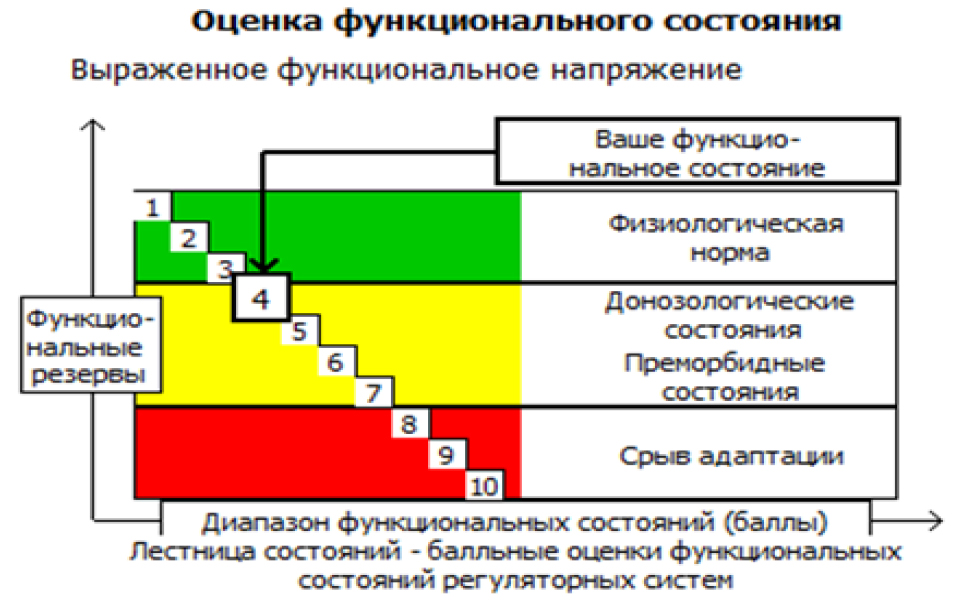 Оценка уровня адаптации и здоровья проводилась с помощью интегративной характеристики «функциональный класс организма», основанной на учении Казначеева В.П. о донозологических адаптационных состояниях, переходных от здоровья, как высокого функционального класса организма, к истощению и срыву адаптационных возможностей и переходу к болезни [8]. Метод ВСР, разработанный Казначеевым В.П. и Баевским Р.М. и основанный на компьютерных технологиях, позволяет оценить не только регуляторные влияния ВНС и ЦНС на функциональные перестройки ССС под влиянием двигательных нагрузок при занятиях ФК, но и физиологическое состояние всего организма.