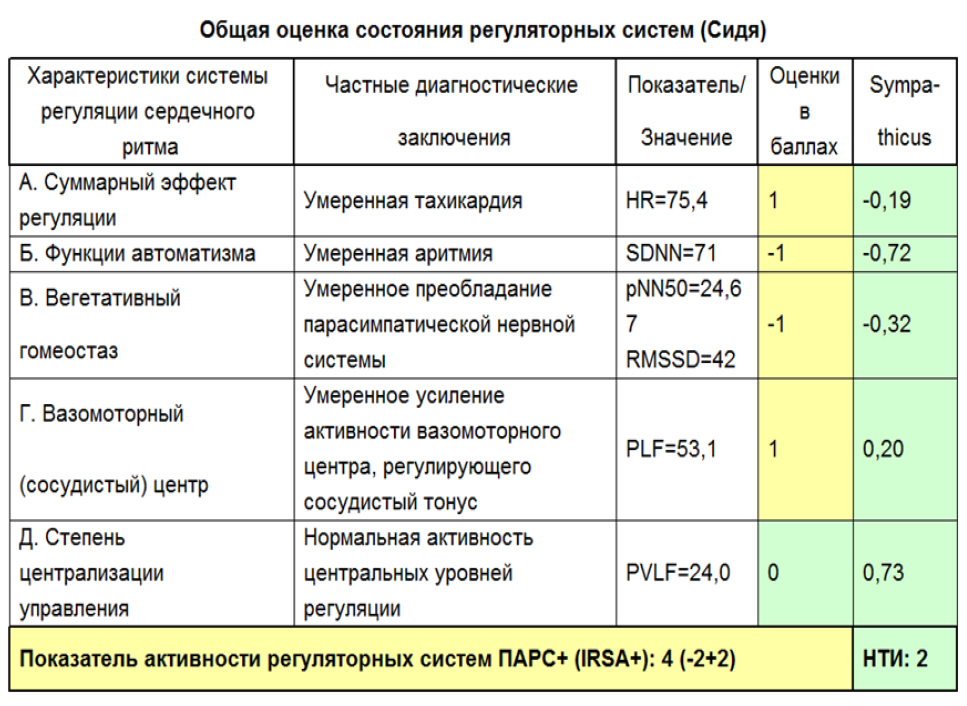 Исследование проведено программно-аппаратным комплексом (ПАК) «Варикард 2.51», который применяли для анализа показателей вариабельности сердечного ритма (ВСР) на основе регистрации ЭКГ. Метод ВКР и его IT программное обеспечение позволяет вычислять до 40 различных параметров функционального состояния организма и регуляторного влияния вегетативной нервной системы (ВНС) и центральной нервной системы (ЦНС) на сердечно-сосудистую стистему (ССС), определяющих показатели адаптации, с помощью которых оценивается уровень здоровья занимающихся. Метод ВСР рекомендуется как российскими, так и европейскими стандартами в области кардиологических исследований [4, 8].