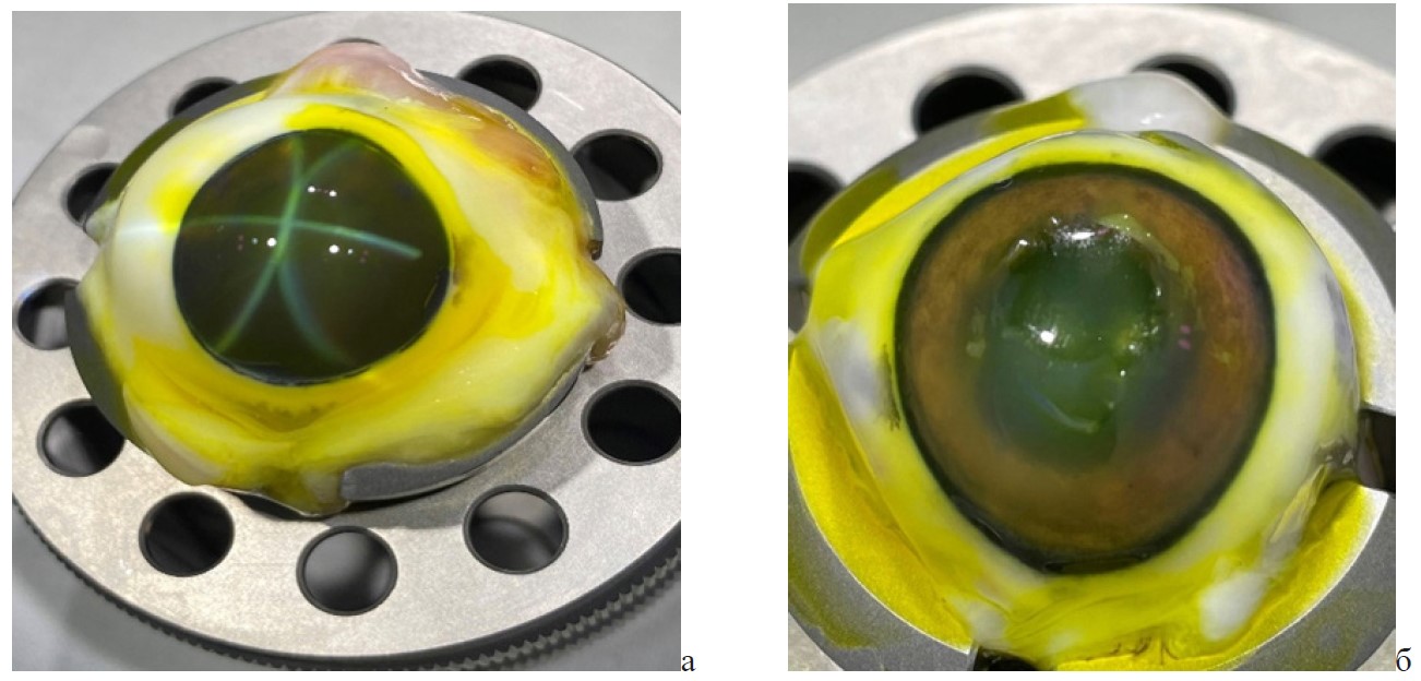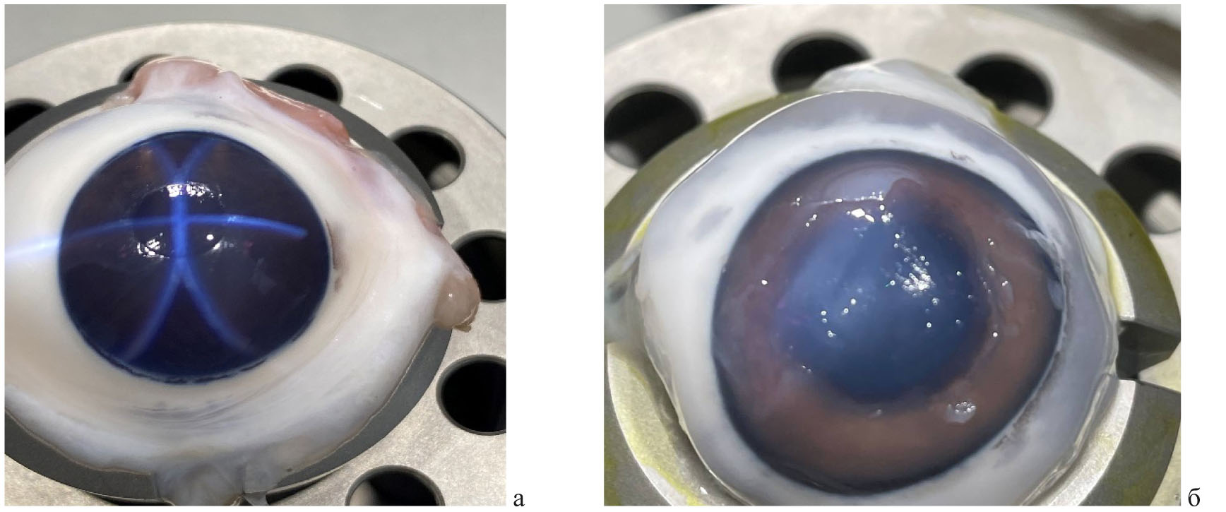 Рис. 4. Фото роговиц свиных кадаверных глаз на этапе насыщения роговицы раствором рибофлавина после проведения частичной эксимерлазерной (а) и полной механической (б) деэпителизации