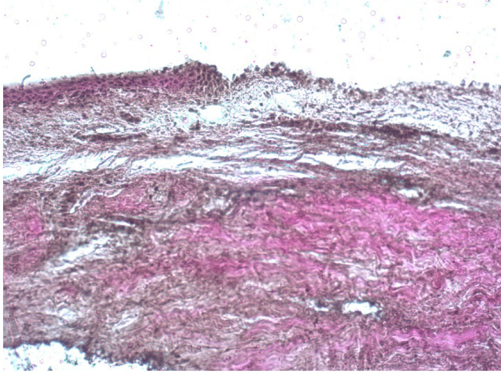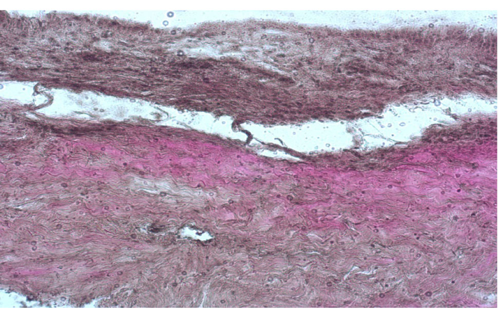 Рис. 5. Роговица свиного кадаверного глаза после полной механической деэпителизации, окраска по Ван Гизону, об. ×10
