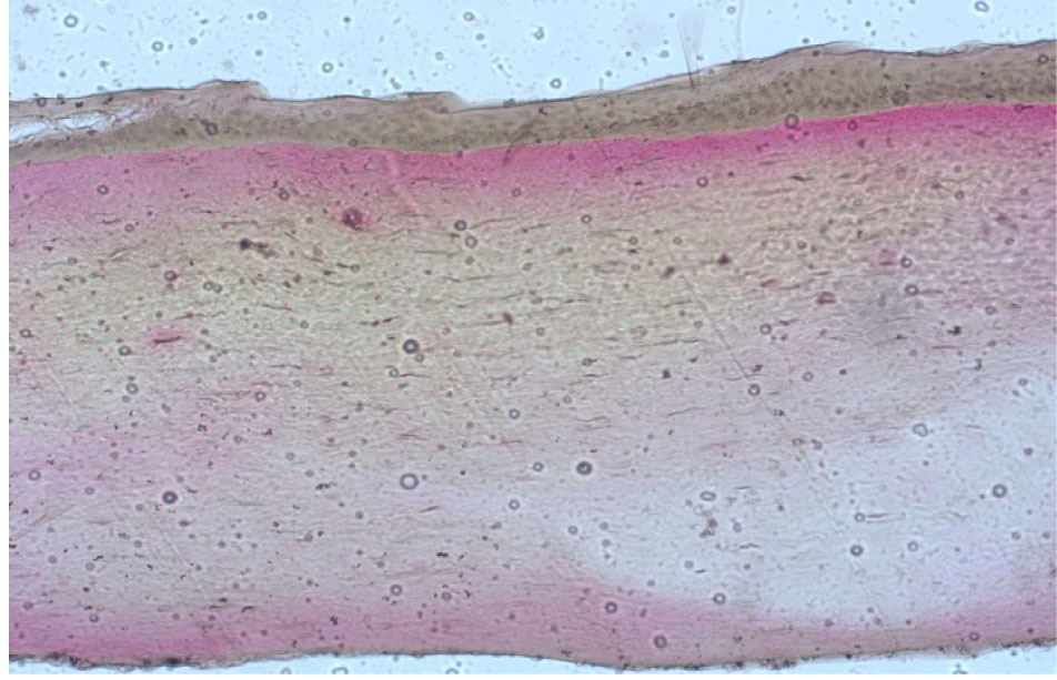 Рис. 7. Интактная роговица свиного кадаверного глаза, окраска по Ван Гизону, об. ×10