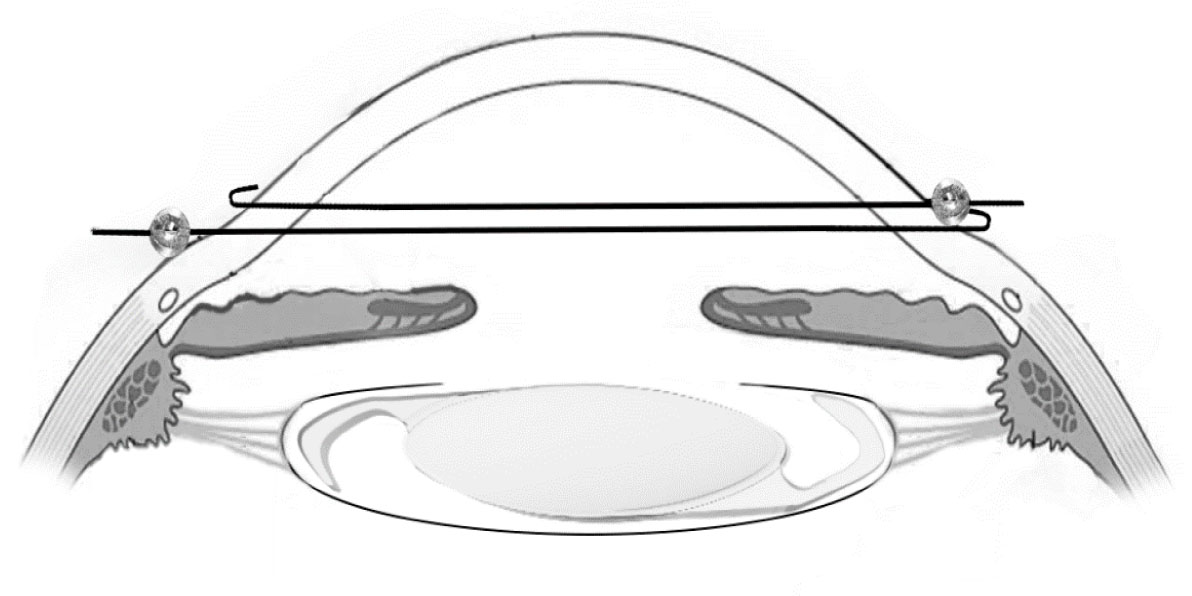 На фоне медикаментозного миоза фиксирующий шов располагают на окружности, проходящей в 3,0 мм от зрачкового края радужки при диаметре зрачка 2,5 мм, что соответствует максимально безопасной анатомической зоне. В зоне одного из гаптических элементов иглу 13 мм кривизной ¼ с нитью полипропилен 10-0 проводят транскорнеально, затем через радужку и переднюю капсулу хрусталика, под гаптической частью ТИОЛ и далее в обратном порядке. Вкол и выкол иглы производят по обе стороны от ретракторов на равном расстоянии с общей дистанцией в интервале 1,4–1,8 мм для правильного позиционирования ИОЛ и предотвращения деформации зрачка в послеоперационном периоде. Скользящий узел Siepser`а [10] формируют так, чтобы ирис-ретракторы были затянуты в шовную петлю. Аналогичные действия проводят с противоположным гаптическим элементом. Затем удаляют ирис-ретракторы, снимая муфту и вытягивая за крючки, при этом формируются шовные петли с дозированным натяжением нити и оптимальной дистанцией «ИОЛ-радужка», что обеспечивается определенной толщиной ретракторов.