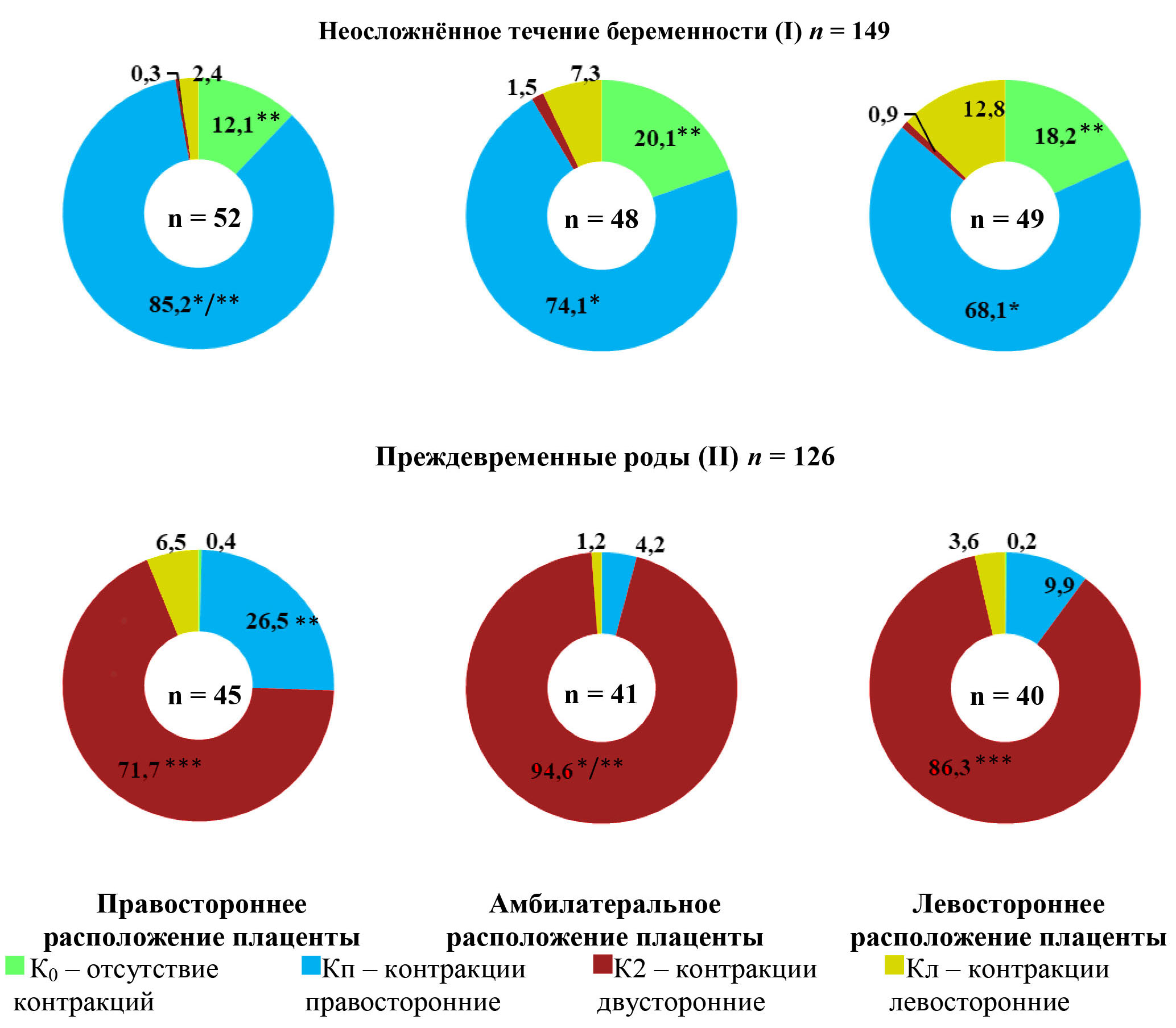 * Статистическая значимость отличий частоты обнаружения одноимённых форм маточных контракций в различных плацентарных подгруппах (р < 0,05); ** статистическая значимость отличий частоты обнаружения различных форм маточных контракций в одной плацентарной подгруппе (р < 0,05); *** статистическая значимость отличий одноименных форм маточных контракций в одноименных плацентарных подгруппах в зависимости от характера течения беременности (р < 0,05).