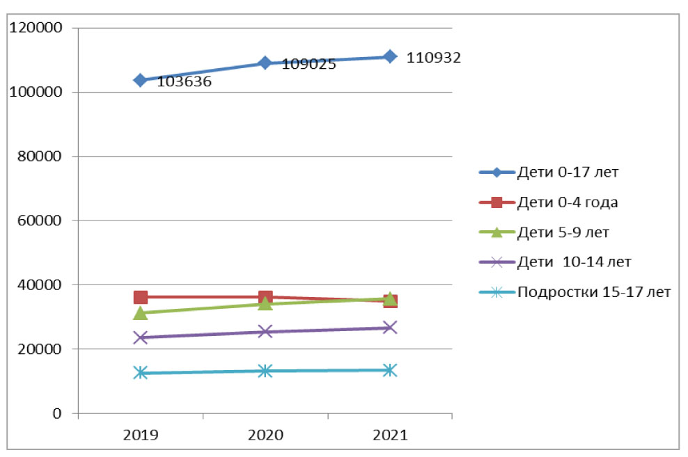 Materials and methods: A comparative analysis of the dynamics of the frequency of general morbidity and pathology, directly or indirectly affecting the reproductive health of children of various age groups for 3 years of the pandemic (2019–2021). Relative and dynamic indicators reflecting the frequency and specific weight of individual nosological units in the overall morbidity were calculated.