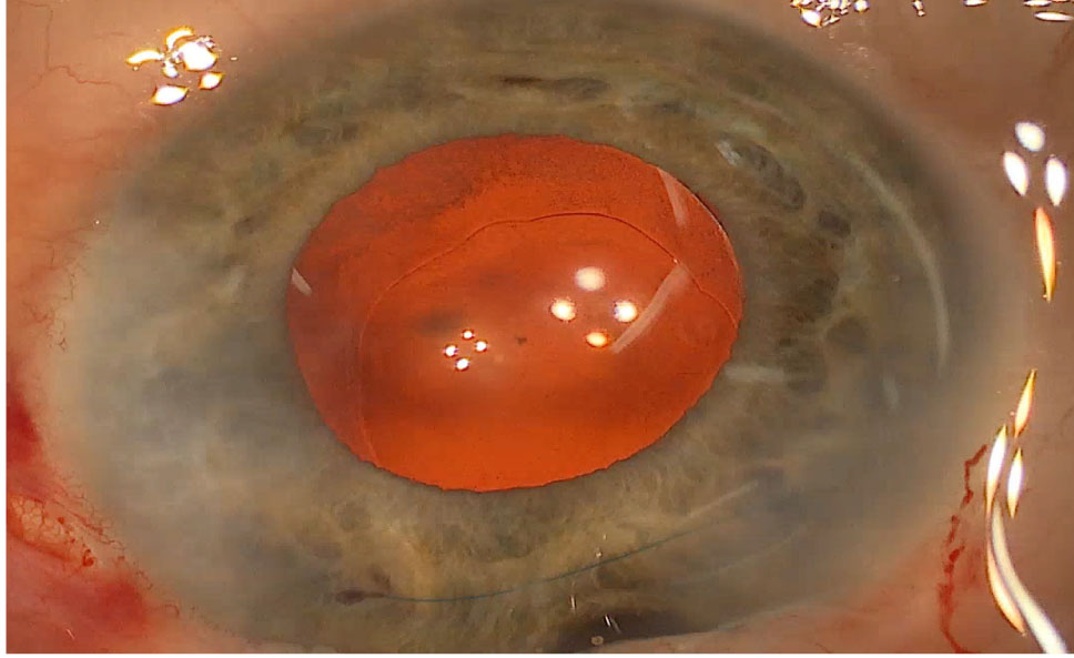 После капельной и парабульной анестезии сформирован основной лимбальный разрез шириной 2 мм и длиной 2 мм на 11 часах и лимбальный парацентез на 2 часах. В переднюю камеру введен 0,2 мл 1%-го раствора Мезатона. Передняя камера заполнена раствором дисперсивного вискоэластика (сочетание гиалуроната натрия 3 % и хондроитинсульфата 4 %, когезивно-дисперсионный индекс <30; вязкость при нулевом сдвиге Vo <104 мПа × с), после канюля с вискоэластиком заведена за радужку и трансзонулярно введен дисперсивный вискоэластик в сторону ретролентального пространства – на 9 и на 3 часах до момента появления волны в ретролентальном пространстве в области экватора хрусталика, что обеспечивает интраоперационную стабильность хрусталика. Цистотомом через основной разрез в центре передней капсулы сформирована капсулотомия. Через парацентез введен вспомогательный инструмент (чопер с закругленным концом) и при умеренном надавливании на ядро хрусталика для дополнительной стабилизации хрусталика сформирован непрерывный круговой капсулорексис цистотомом диаметром 5,5 мм. После щадящей гидродиссекции и гидроделиниации ротация ядра не проведена с целью профилактики дополнительного диализа цинновых связок. Произведена факофрагментация и эмульсификация ядра хрусталика по методу «горизонтальный факочоп». После чего повторно стабилизирован капсульный мешок, введением адгезивного вискоэластика в переднюю камеру и капсульный мешок, одномоментно с проведением вискодиссекции кортикальных масс, а также трансзонулярно в ретролентальное пространство. После аспирации хрусталиковых масс произведена имплантация внутрикапсульного кольца и ИОЛ при помощи инжектора в капсульный мешок. Для профилактики децентрации и дислокации комплекса «ИОЛ + капсульный мешок» в позднем послеоперационном периоде произведено подшивание верхней гаптики ИОЛ к радужке (рис.). После вымывания вискоэластика проведена гидратация парацентеза и основного разреза. Щадящая техника операции и применение дисперсивного вискоэластика позволили добиться стабильности капсульного мешка на всех этапах хирургии катаракты.